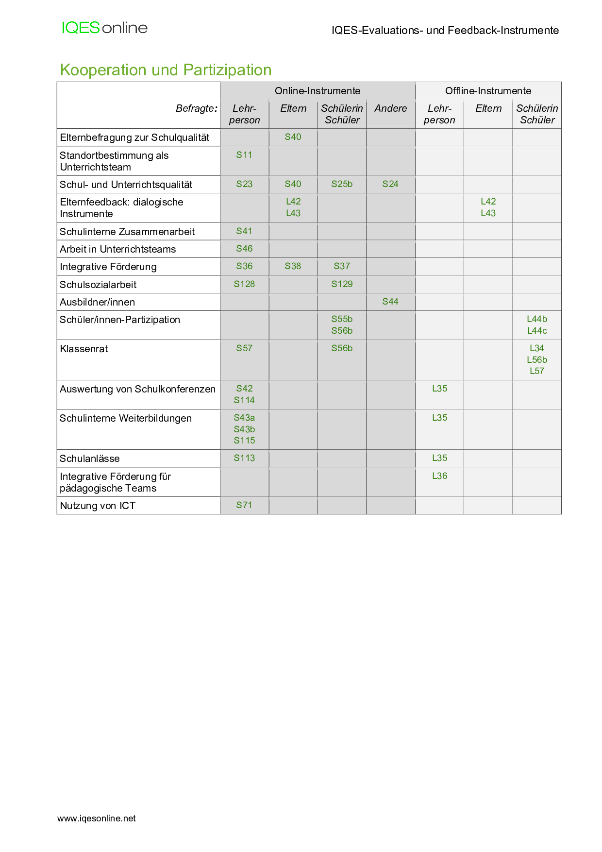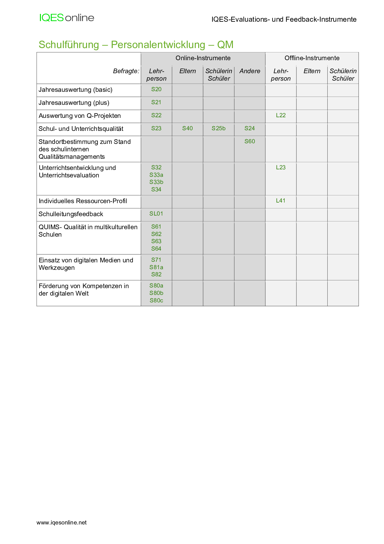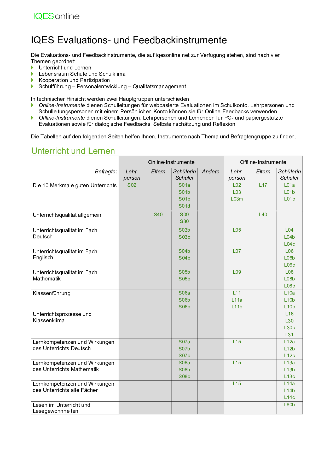 Übersicht über die verschiedenen Feedback- und Evaluationsinstrumente, die auf iqesonline.net zur Verfügung gestellt werden. Sie sind geordnet nach den vier Themenbereichen Unterricht und Lernen, Lebensraum Schule und Schulklima, Kooperation und Partizipation sowie Schulführung, Personalentwicklung und Qualitätsmanagement.