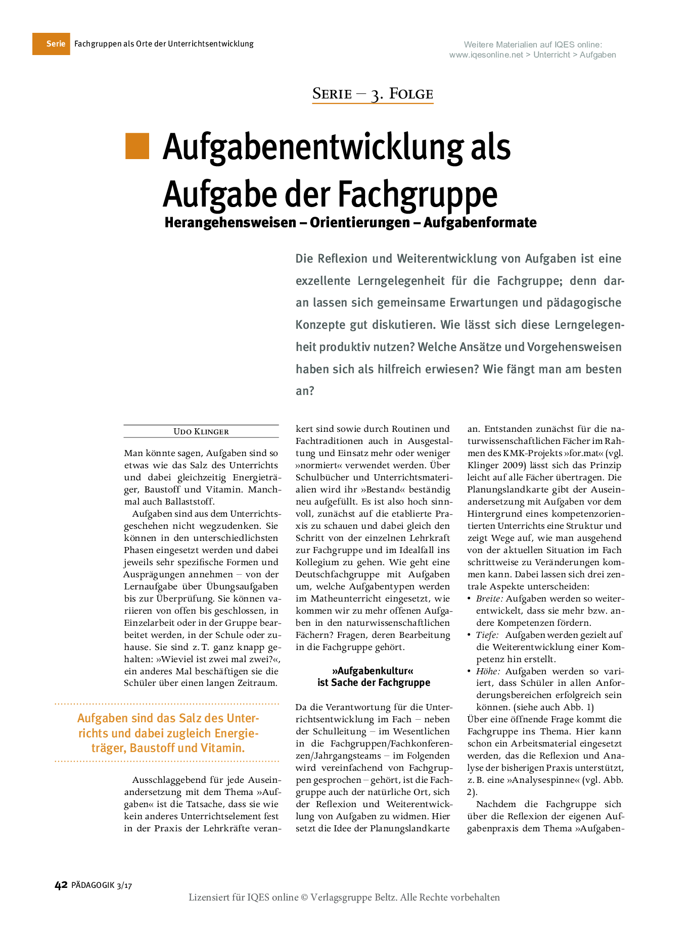 In diesem Fachartikel geht es um die produktive Nutzung der Aufgabenentwicklung in der Fachgruppe. Dazu werden hilfreiche Ansätze und Vorgehensweisen vorgestellt, mit denen ein solcher Prozess in Bewegung gesetzt werden kann.