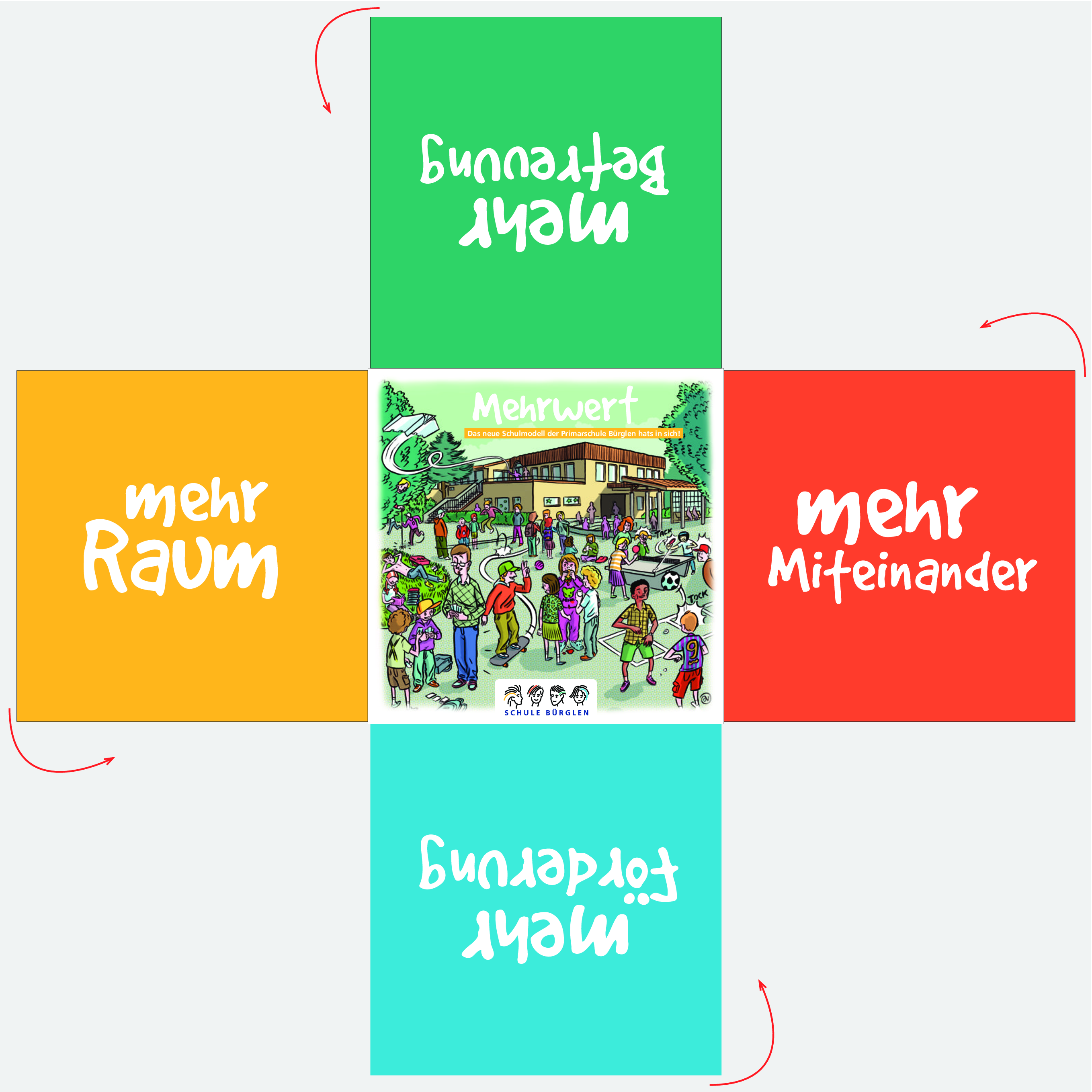 Dieser Text ist als grosses Plus-Zeichen gestaltet, womit eine Assoziation mit etwas Positivem dargestellt werden soll. Anhand dessen wird das Schulmodell der Schule Bürglen vorgestellt. Dabei sind auf diesem Faltflyer vier zentrale Aspekte zusammengefasst.