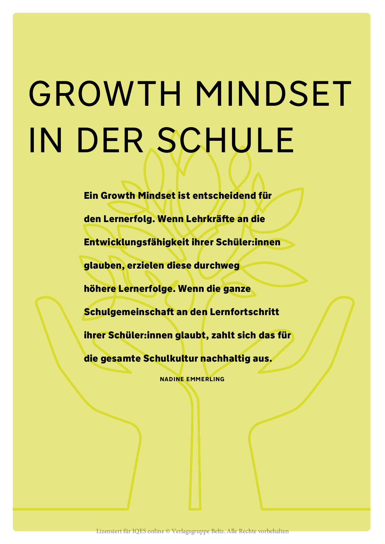 Ein Growth Mindset ist entscheidend für den Lernerfolg. Wenn Lehrkräfte an die Entwicklungsfähigkeit ihrer Schüler:innen glauben, erzielen diese durchweg höhere Lernerfolge. Wenn die ganze Schulgemeinschaft an den Lernfortschritt ihrer Schüler:innen glaubt, zahlt sich das für die gesamte Schulkultur nachhaltig aus.