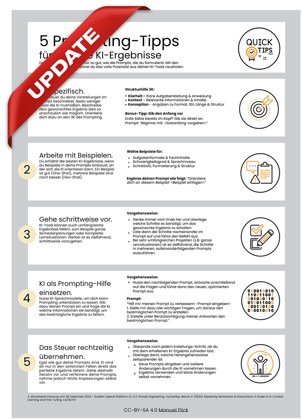 Manuel Flick hat seinen beliebten Prompting-Leitfaden überarbeitet und erweitert: Neu ist ein Kapitel zum Einsatz von Prompts mit fortgeschrittenen Reasoning-Modellen dazugekommen. Der Leitfaden erklärt praxisnah, wie KI durch gezieltes Prompting effektiv für den Unterricht genutzt werden kann – ergänzt durch ein anschauliches Poster.