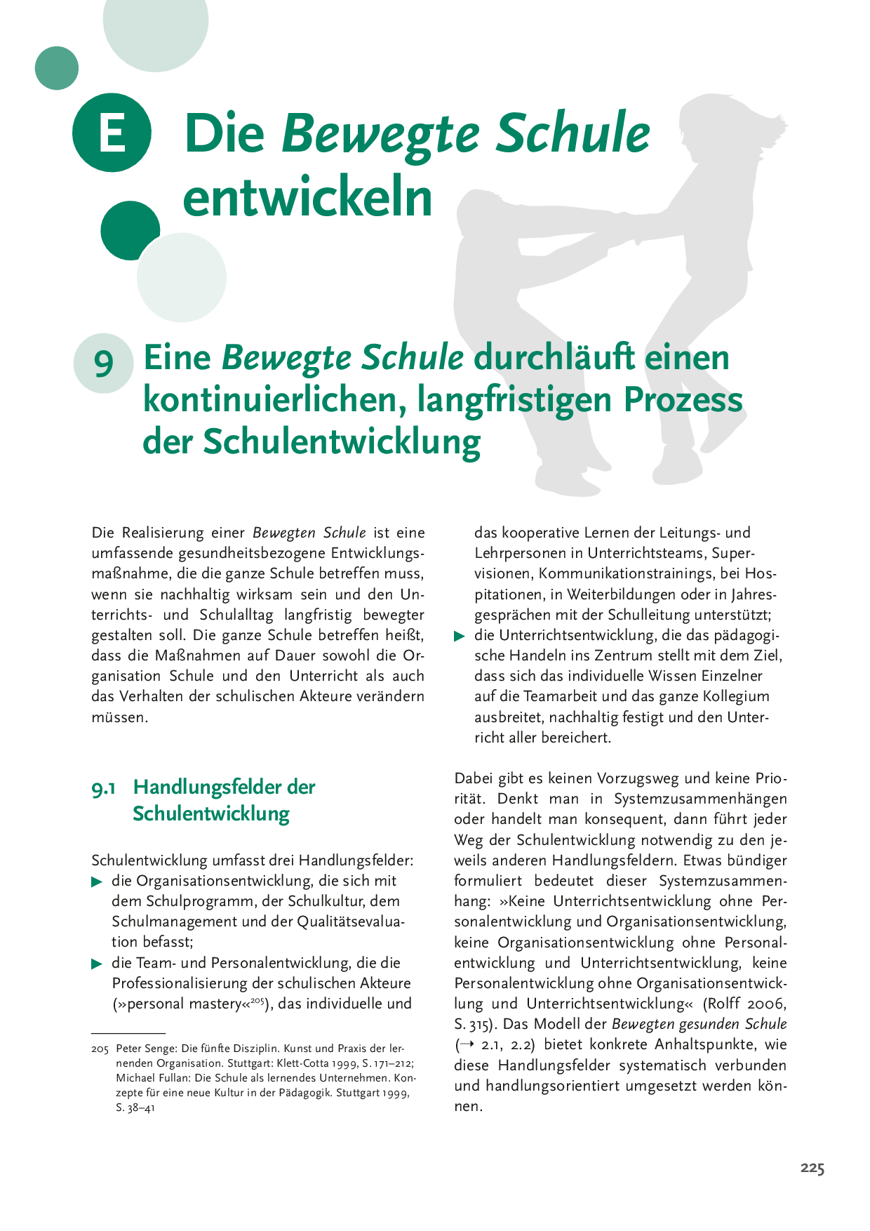 Was sind die Gelingensbedingungen einer kooperativen Schul- und Unterrichtsentwicklung? Wie können schulinterne Weiterbildungen als Motoren einer teamorientierten und lernbasierten Entwicklung genutzt werden? Wie können Unterrichtsteams als Schlüssel für nachhaltige Unterrichtsentwicklung aufgebaut werden? Wie werden die Ergebnisse der Kooperation als Vereinbarungen im Schulprogramm gesichert und verbindlich gemacht? Wie kann schulinterne Evaluationen für die Entwicklung einer Bewegten Schule fruchtbar gemacht werden können. Neben den Handlungsfeldern der Schulentwicklung und den unterschiedlichen Phasen dieser, werden in diesem Beitrag auch konkrete Schulentwicklungsbeispiele geliefert. Im Fokus steht die Bewegte Schule.