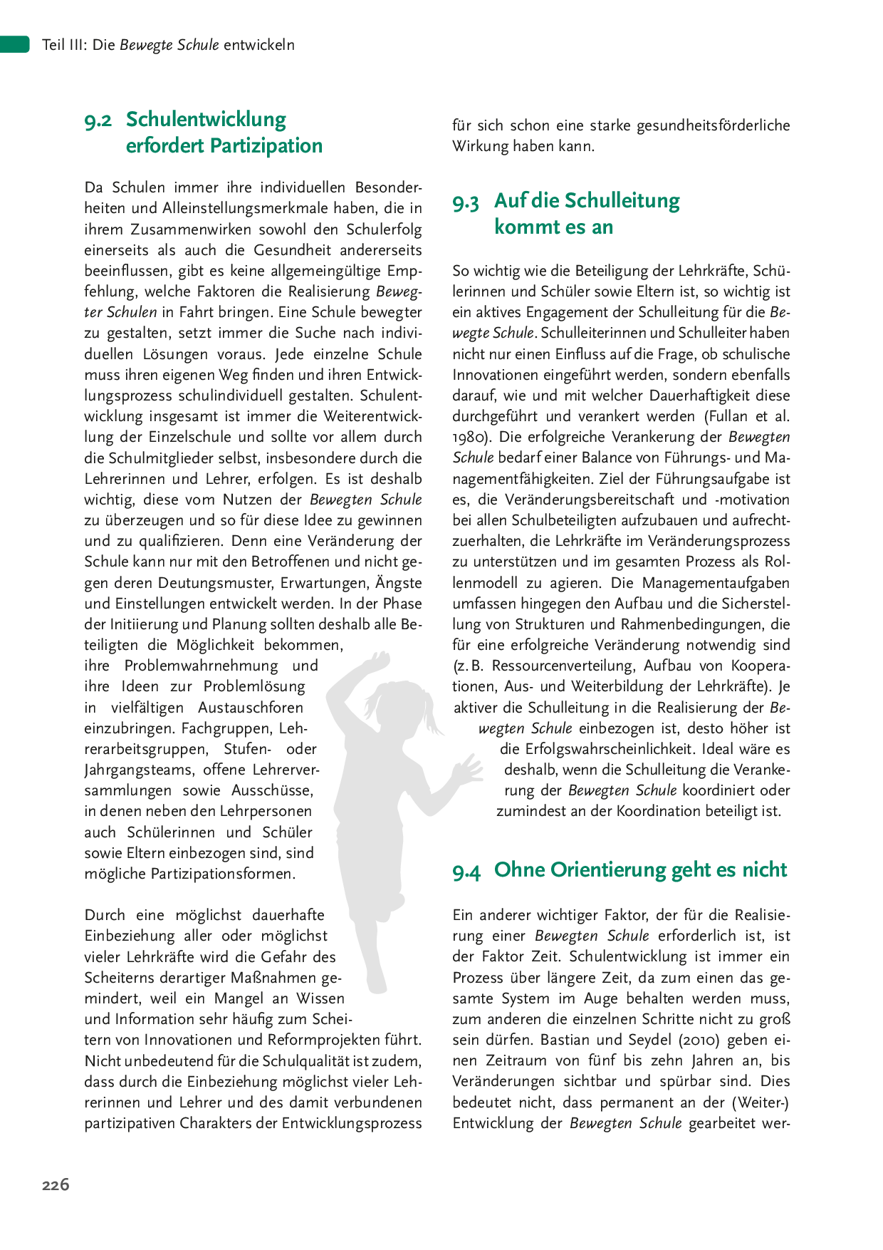 Eine Bewegte Schule durchläuft einen langfristig angelegten Prozess der Schulentwicklung. Nachhaltigkeit wird erreicht durch praxisnahe Fortbildungen, Teamentwicklung, interne Evaluation und die Verankerung von Bausteinen der Bewegten Schule im Schulprogramm. Schulentwicklungsexperten zeigen, wie Schulleitungen diesen Prozess steuern können.