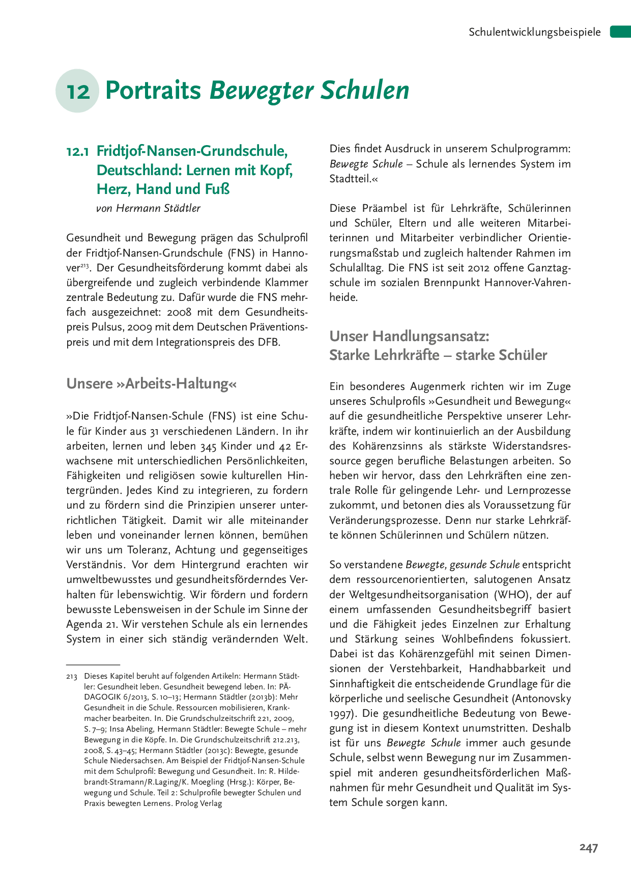 In diesem Portrait mit dem Fokus auf Bewegung in der Schule wird die Fridtjof-Nansen-Grundschule in Hannover vorgestellt. Denn der Gesundheitsförderung kommt in dieser Schule als übergreifende und zugleich verbindende Klammer zentrale Bedeutung zu.