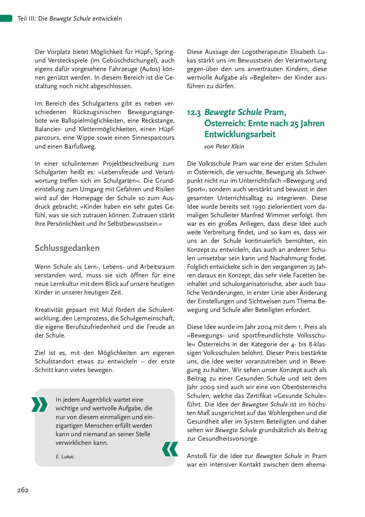 Die Volksschule Pram war eine der ersten Schulen in Österreich, die versuchte, Bewegung als Schwerpunkt nicht nur im Unterrichtsfach «Bewegung und Sport», sondern auch verstärkt und bewusst in den gesamten Unterrichtsalltag zu integrieren. Die Schule beschreibt Meilensteine und Ergebnisse einer langjährigen Pionierarbeit. Das eine solche nie abgeschlossen sein kann, sondern ihr Kennzeichen eben gerade Bewegung und nicht Still-Stand ist, bringt ein Zitat des aktuellen Schulleiters, Peter Klein, schön zum Ausdruck: «Unsere Schule befindet sich seit vielen Jahren immer in Bewegung und obwohl wir nun bereits 25 Jahre Bewegte Schule gestalten, sehe ich unsere Schule heute noch als eine ‹Schule im Aufbruch› ».