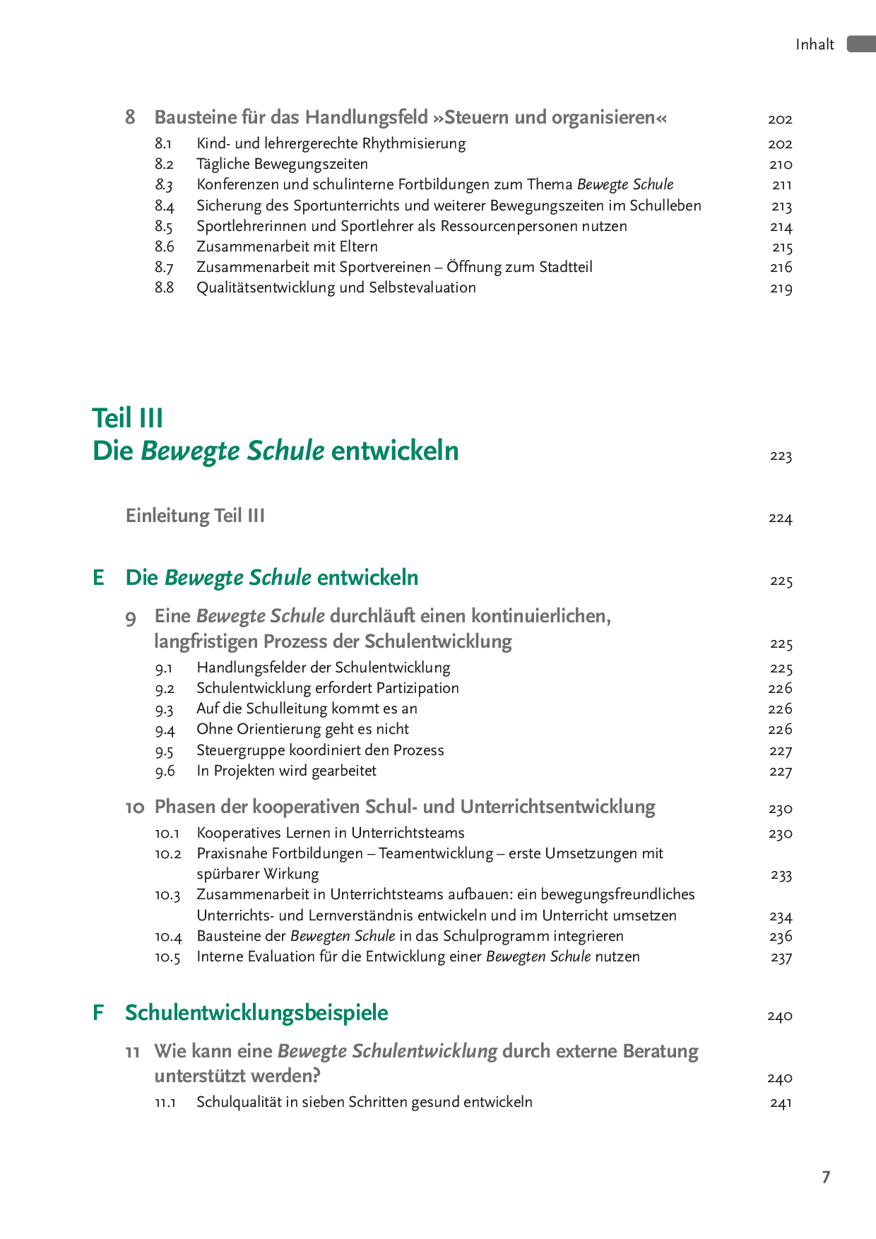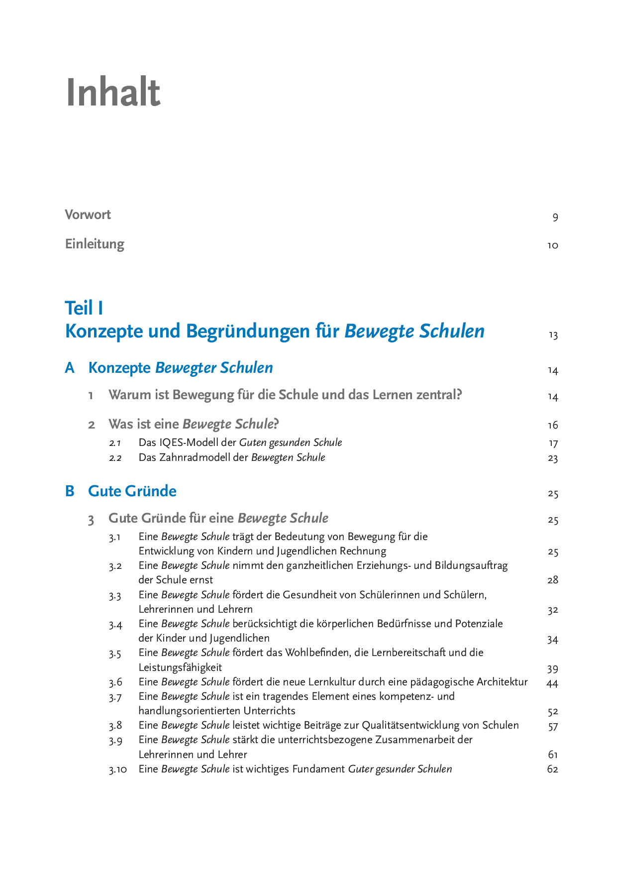 Ein internationales Expertenteam liefert wissenschaftliche Gründe und schulpraktische Anregungen für eine zeitgemäße Verwirklichung der Idee der Bewegten Schule. Aufbauend auf der kreativen Praxis von Pionierschulen in Deutschland, der Schweiz, Österreich und Südtirol/Italien stellen die Autoren ein Handlungsmodell mit Bausteinen für eigene Entwicklungswege an Schulen vor. Die Publikation zeigt, wie Schulen mit Bewegung Schulqualität entwickeln können.