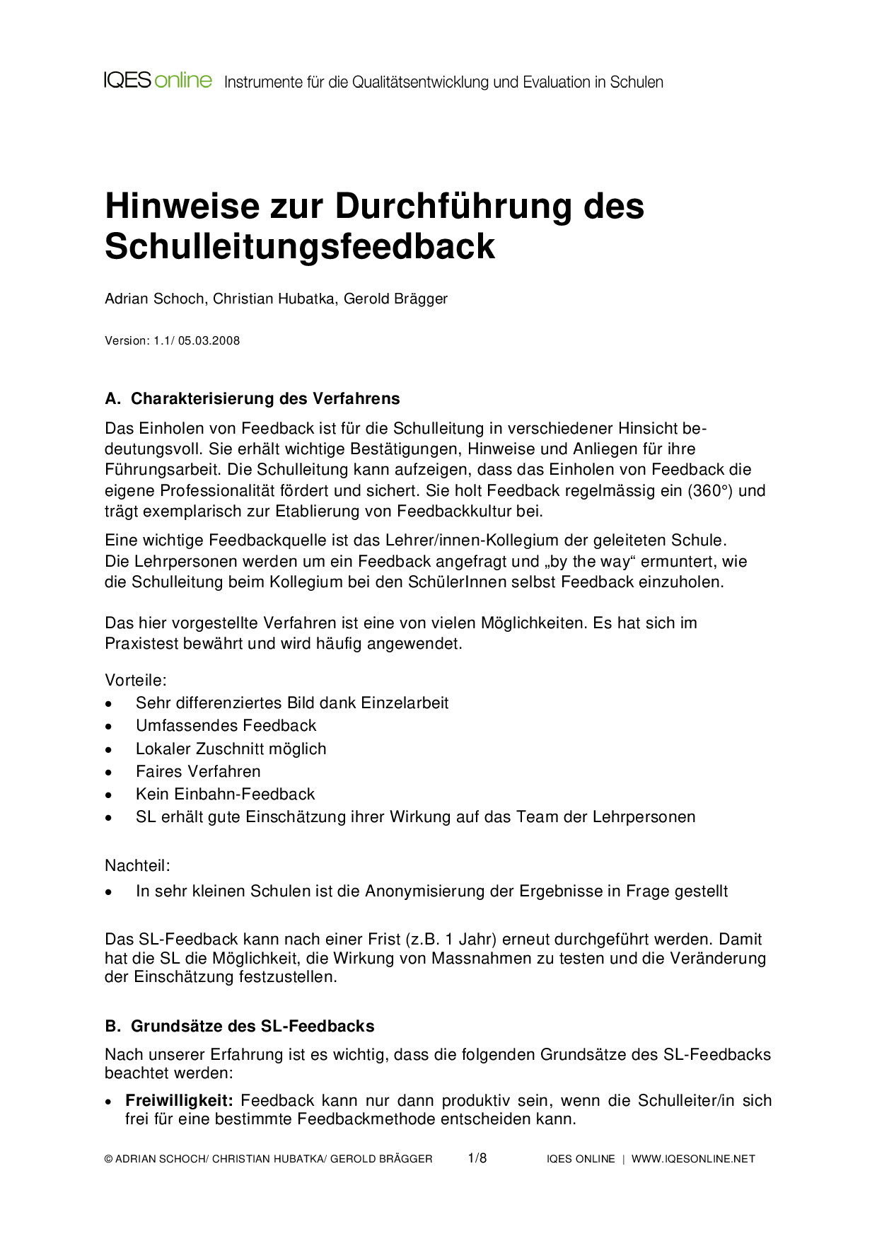 Hier wird ein Verfahren beschrieben, mit dem Schulleiterinnen und Schulleiter regelmässig ein Feedback bei den Lehrpersonen einholen können. Es wird aufgezeigt, welche Vorbereitungen und Schritte notwendig sind. Im Anhang befinden sich einige Beispiele Aufträgen und Ablauf des Feedbacks.
