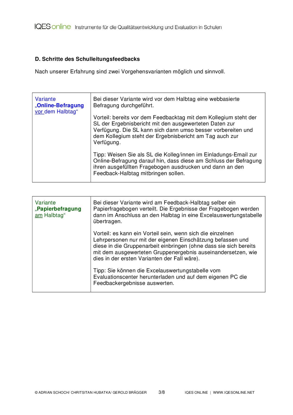 Der Einschätzbogen enthält Bewertungstabellen, mit deren Hilfe Sie beurteilen können, wo Ihre Schule beim Aufbau einer schulinternen Feedback- und Evaluationskultur steht, welche Elemente eines ganzheitlichen Qualitätsmanagement an Ihrer Schule bereits gut ausgebaut sind und welche noch weiterer Entwicklungsschritte bedürfen.