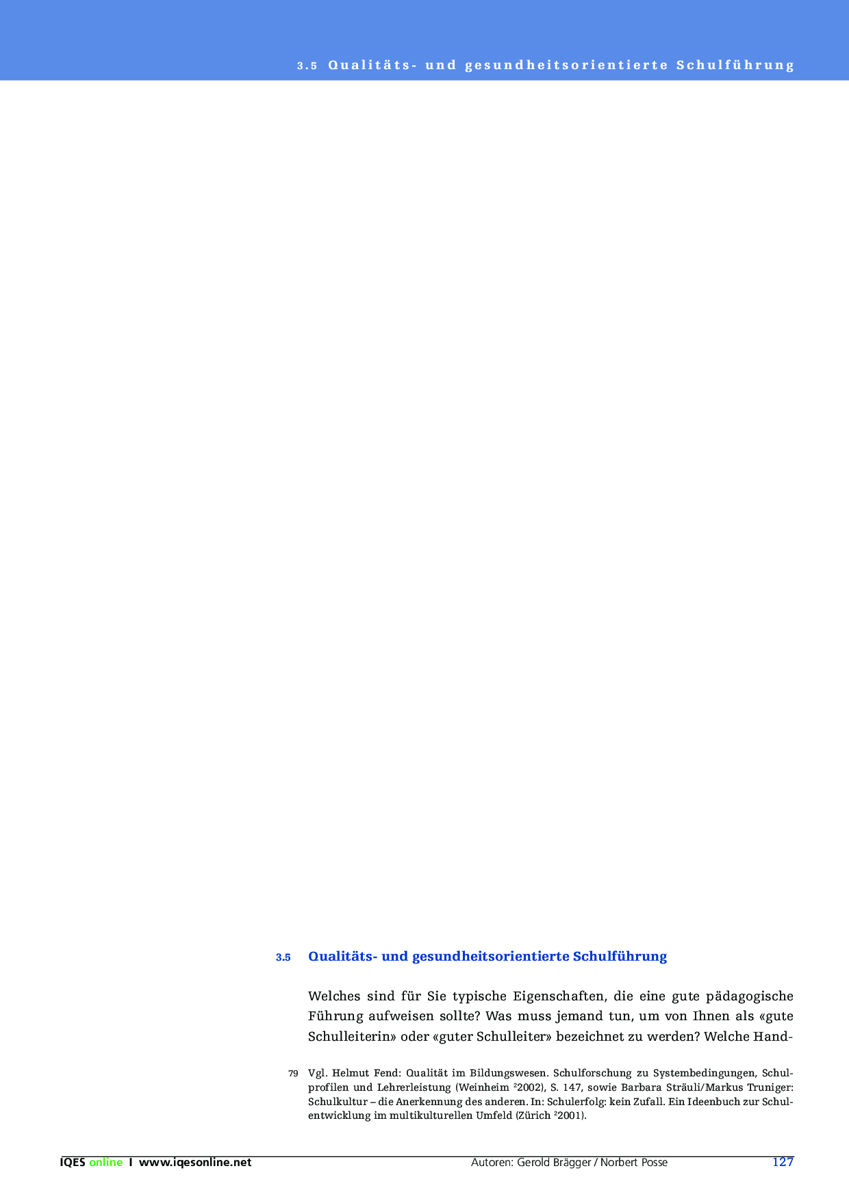 Welches sind für Sie typische Eigenschaften, die eine gute pädagogische Führung aufweisen sollte? Was muss jemand tun, um von Ihnen als «gute Schulleiterin» oder «guter Schulleiter» bezeichnet zu werden? Antworten dazu liefert das Kapitel 3.5 zum Thema Qualitäts- und gesundheitsorientierte Schulführung.