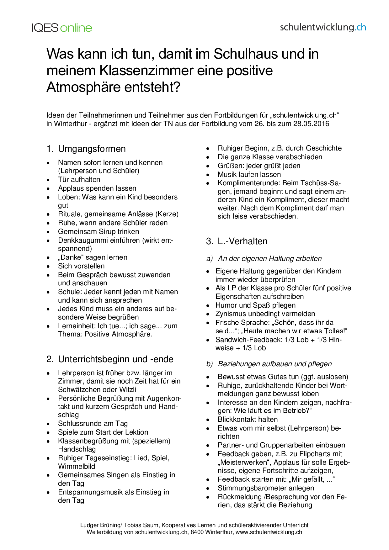 Was kann ich tun, damit im Schulhaus und in meinem Klassenzimmer eine positive Atmosphäre entsteht? Ideen der Teilnehmerinnen und Teilnehmer aus den Fortbildungen für schulentwicklung.ch in Winterthur.