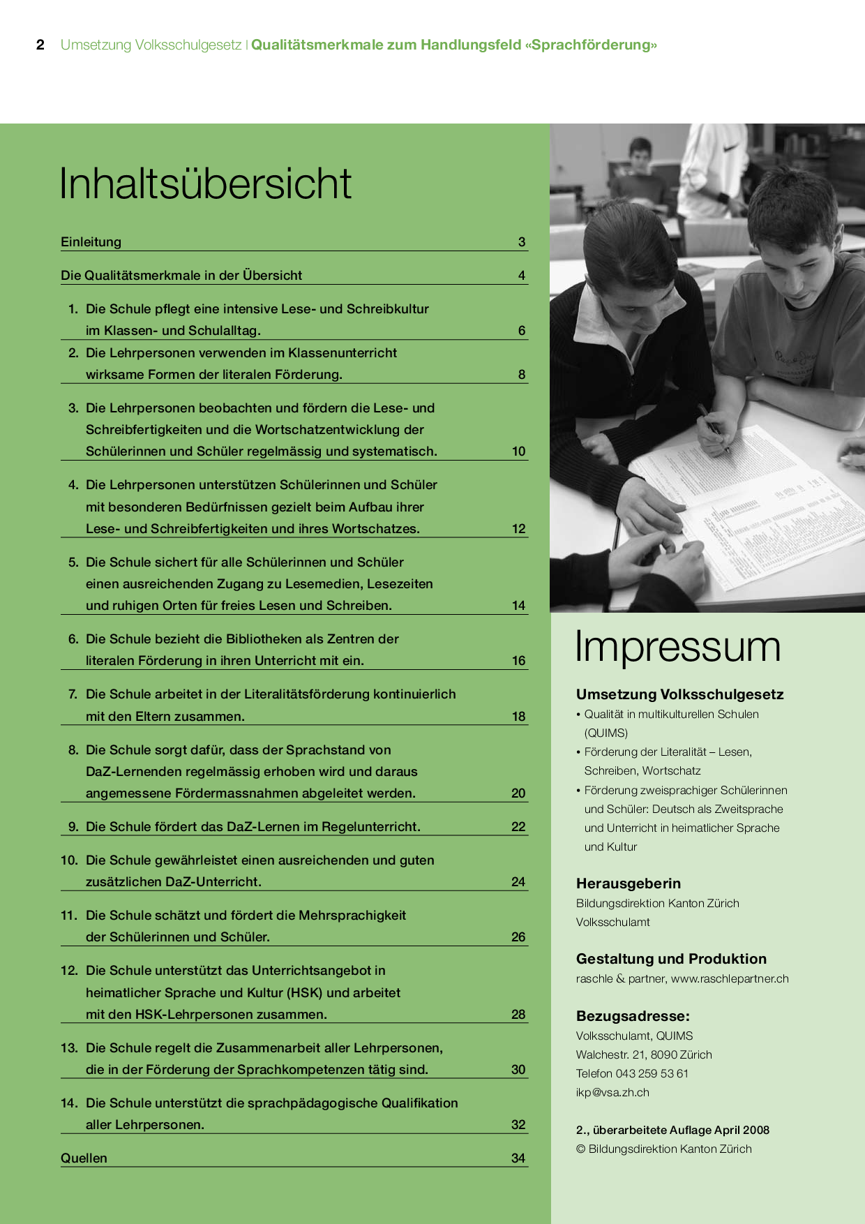 Die vorliegende Broschüre der Bildungsdirektion Kanton Zürich dient als Orientierungshilfe für Schulen, die zur Sprachförderung ihren Ist-Zustand erheben und bewerten wollen. Sie eignet sich auch als Instrument, um entsprechende Massnahmen zu planen, die Fortschritte in der pädagogischen Schulentwicklung zu beobachten und regelmässig die Zielerreichung zu überprüfen.