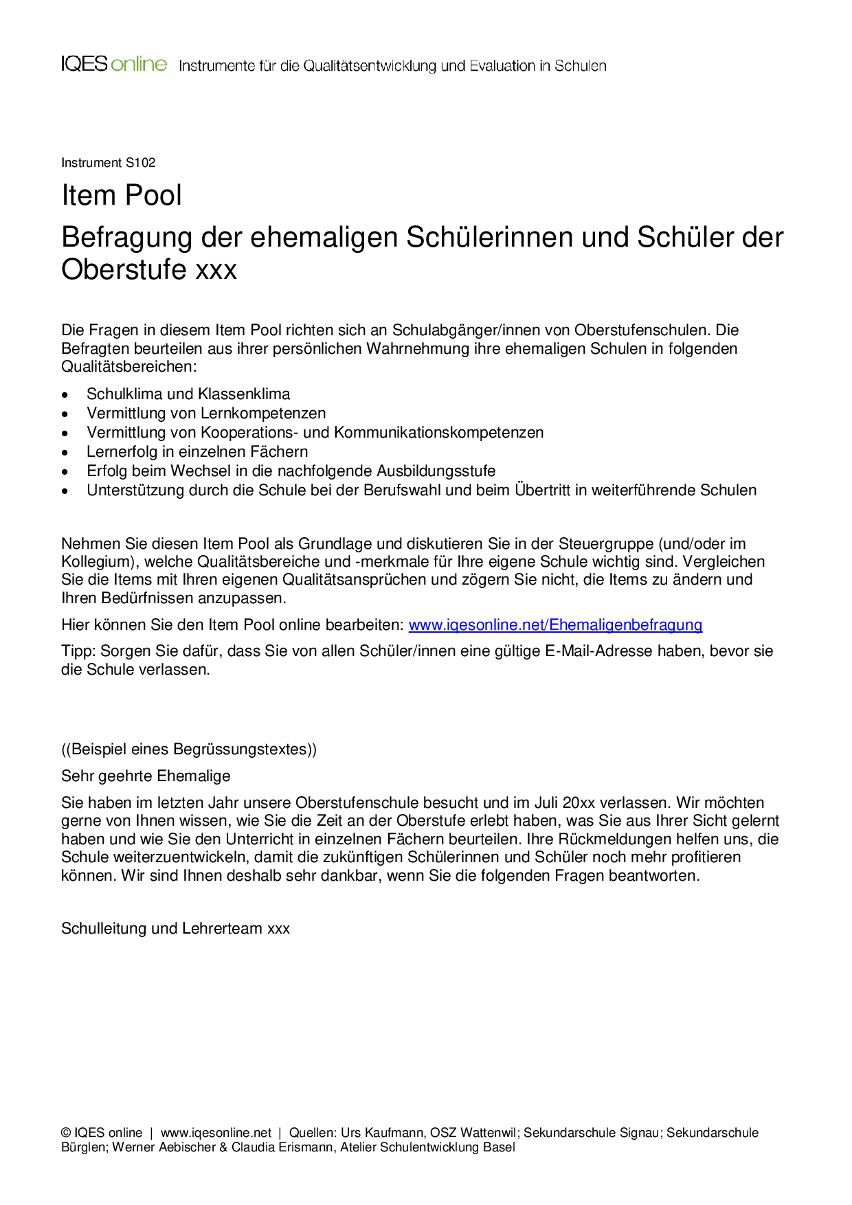 Item Pool S102: Befragung der ehemaligen Schülerinnen und Schüler der Oberstufe
