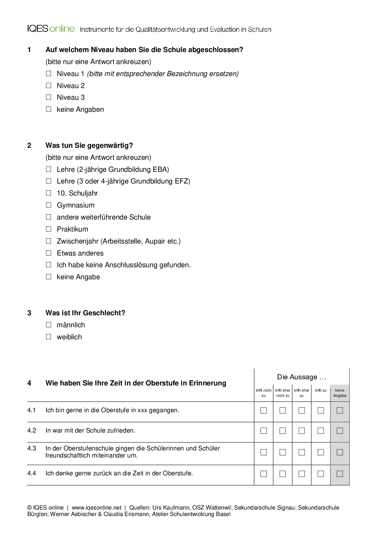 Fragebogen zur Befragung von ehemaligen Schülerinnen und Schüler der Oberstufe.
