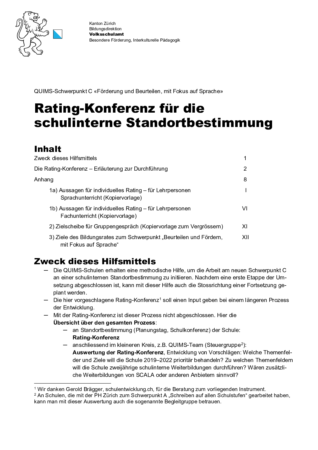 In diesem Dokument finden Sie eine Anleitung zur Durchführung einer Ratingkonferenz zum QUIMS-Schwerpunkt C «Förderung und Beurteilen, mit Fokus auf Sprache». Im Anhang sind unterstützende Kopiervorlagen zur Verfügung gestellt.