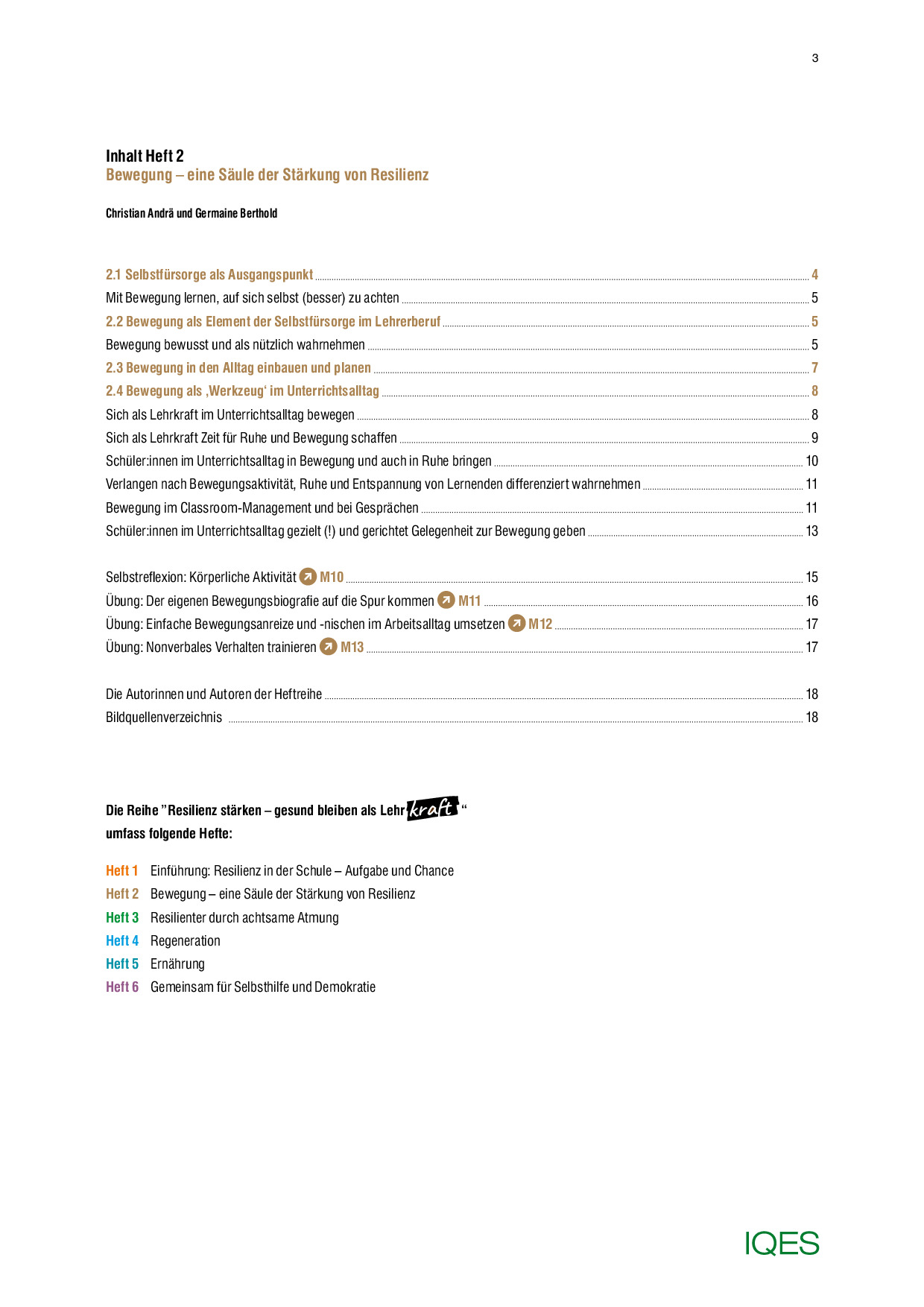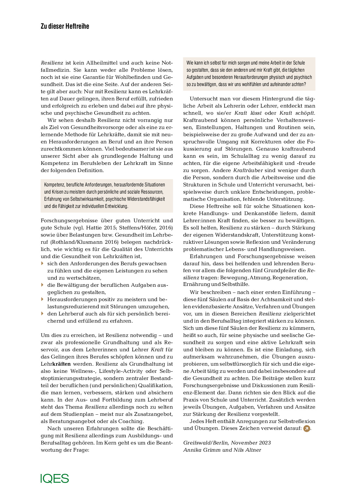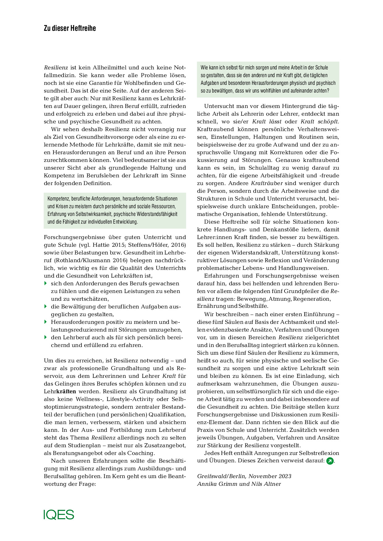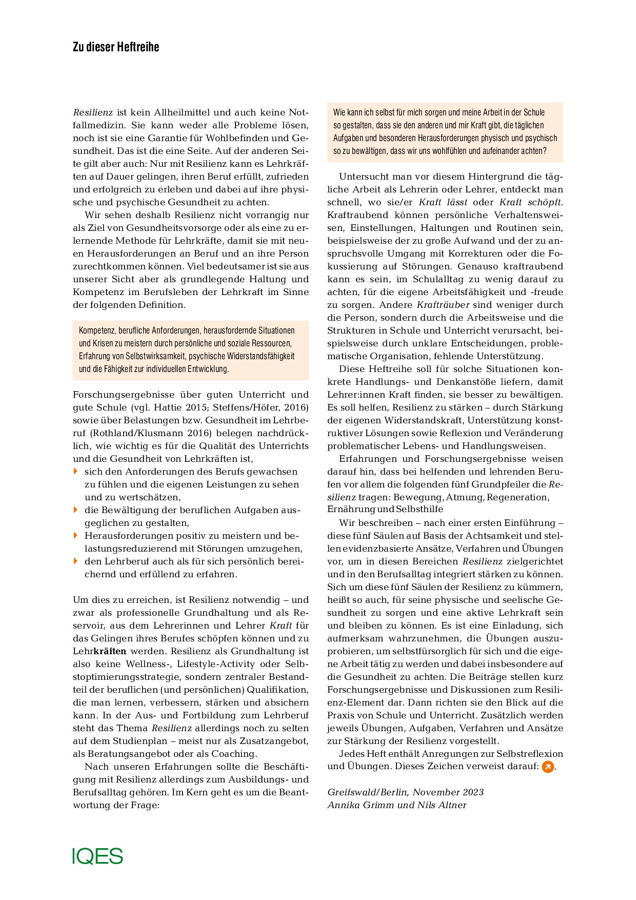 Immer mehr Lehrkräfte fragen sich, wie sie ihre Stressresilienz verbessern und ihre Gesundheitsressourcen sinnvoll nutzen können. Unsere IQES-Leitfäden stellen Ihnen fünf wirksame Strategien vor, um die eigene Gesundheit und Widerstandskraft zur stärken. Mit praxisnahen Übungen und Anregungen für mehr persönliche und berufliche Achtsamkeit finden Sie darin Hilfen zur Selbsthilfe für Ihren beruflichen Alltag.