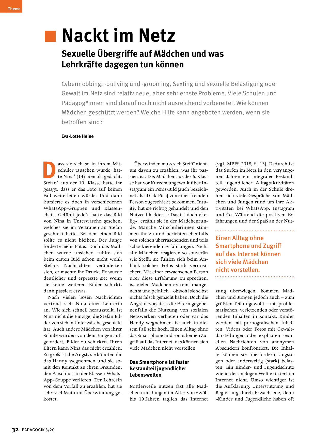 Cybermobbing, -bullying und -grooming, Sexting und sexuelle Belästigung oder Gewalt im Netz sind relativ neue, aber sehr ernste Probleme. Viele Schulen und Pädagog*innen sind darauf noch nicht ausreichend vorbereitet. Wie können Mädchen geschützt werden? Welche Hilfe kann angeboten werden, wenn sie betroffen sind? Besonders Mädchen sind von sexuellen Übergriffen betroffen Die ausgewerteten Ergebnisse der MiKADO-Studie (2014) machen deutlich, dass bereits über 15 Prozent der Kinder im Alter von 14 Jahren im Internet sexuell belästigt wurden. Bei dem sogenannten Cybergrooming schreiben Erwachsene gezielt Kinder und Jugendliche über das Internet an, um einen sexuellen Kontakt herzustellen