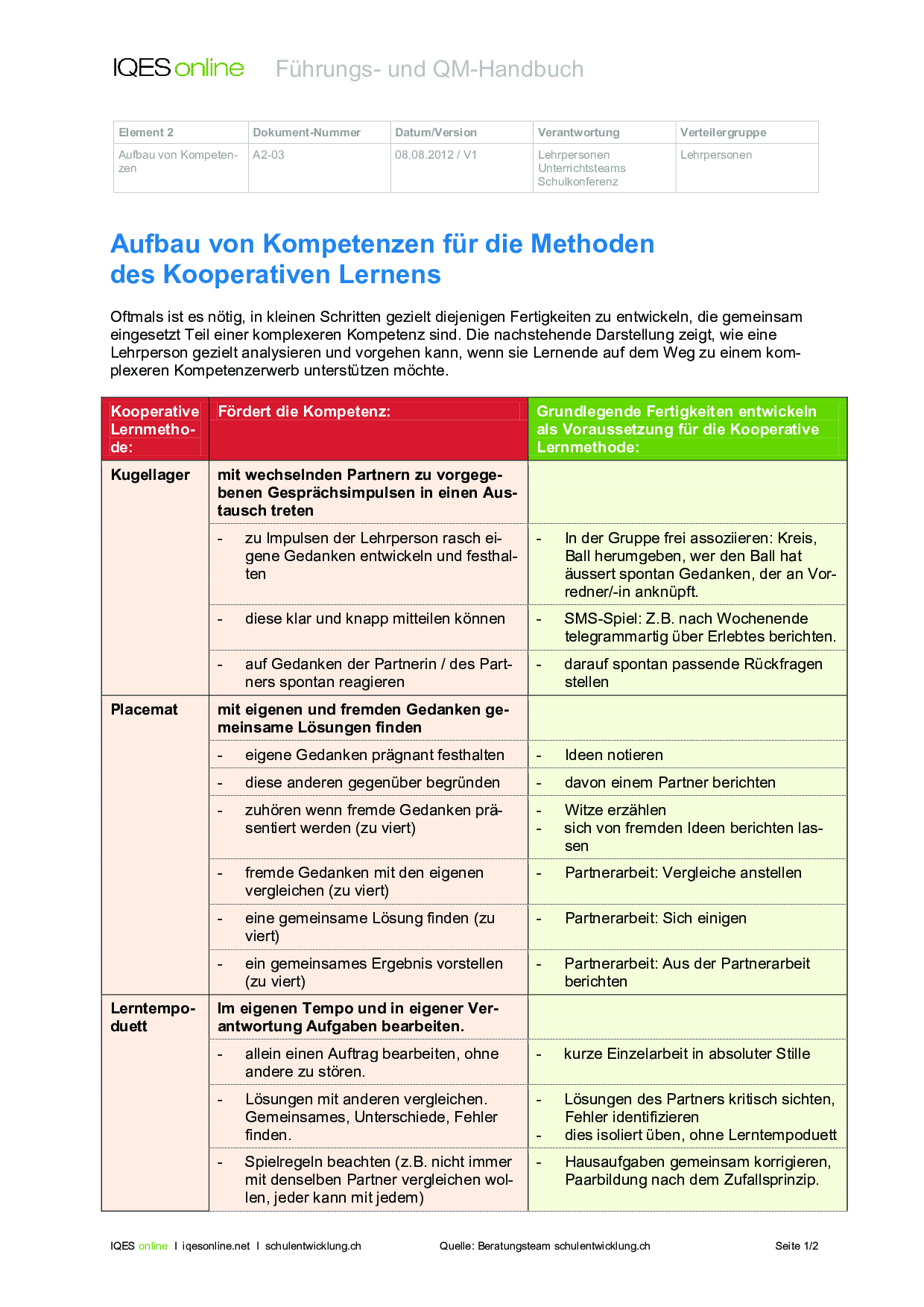 Dieses Dokument enthält eine Darstellung unterschiedlicher kooperativer Lehrmethoden. Sie zeigt, wie eine Lehrperson gezielt analysieren und vorgehen kann, wenn sie Lernende auf dem Weg zu einem komplexeren Kompetenzerwerb unterstützen möchte.