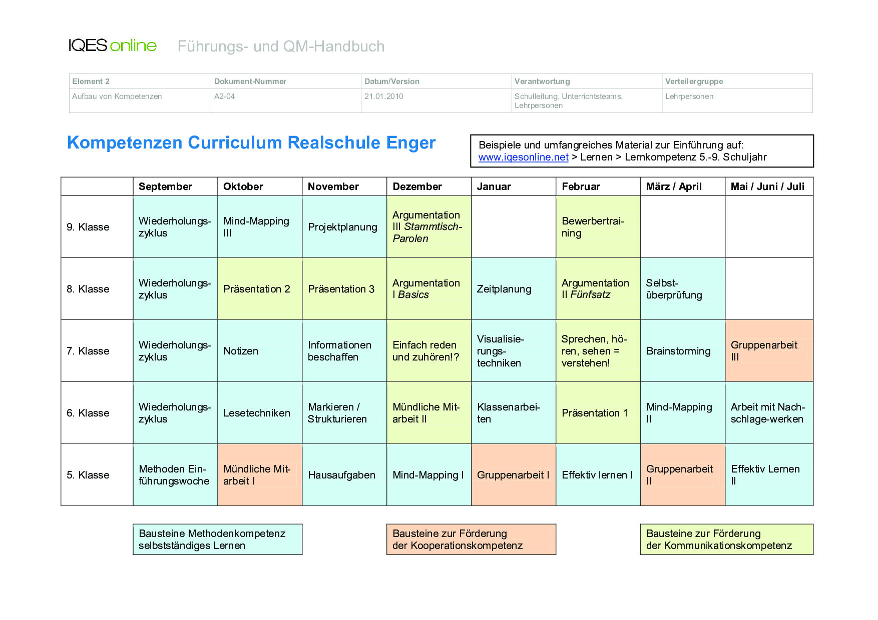 In diesem Dokument ist der Kompetenzen-Curriculum der Realschule Enger zu finden. Dabei sind die Bausteine zur Methodenkompetenz selbstständiges Lernen, zur Förderung der Kooperationskompetenz sowie zur Förderung der Kooperationskompetenz zentral.