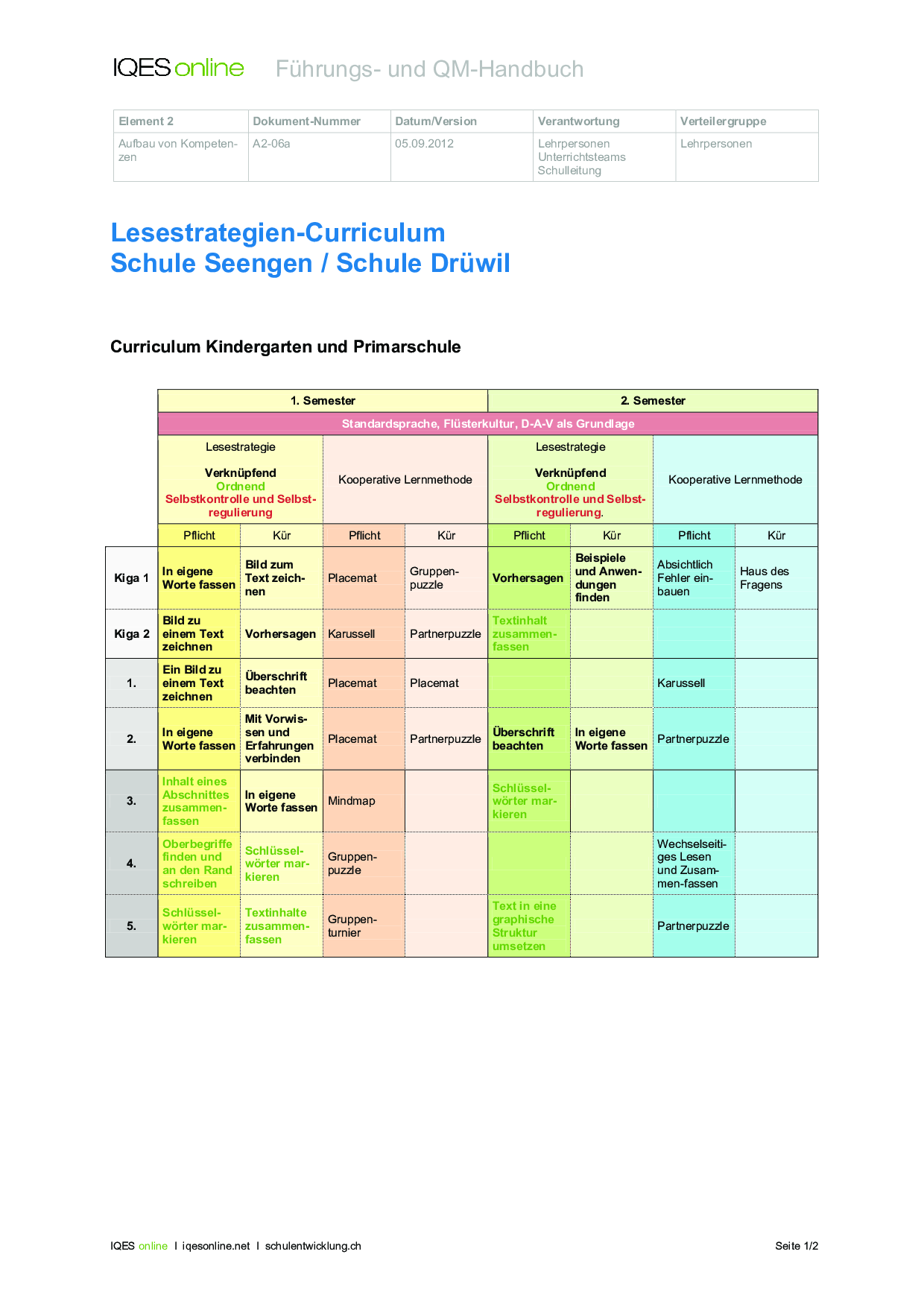 Das Lesestrategien-Curriculum der Schulen Seengen und Drüwil für den Kindergarten und die Primarstufe.