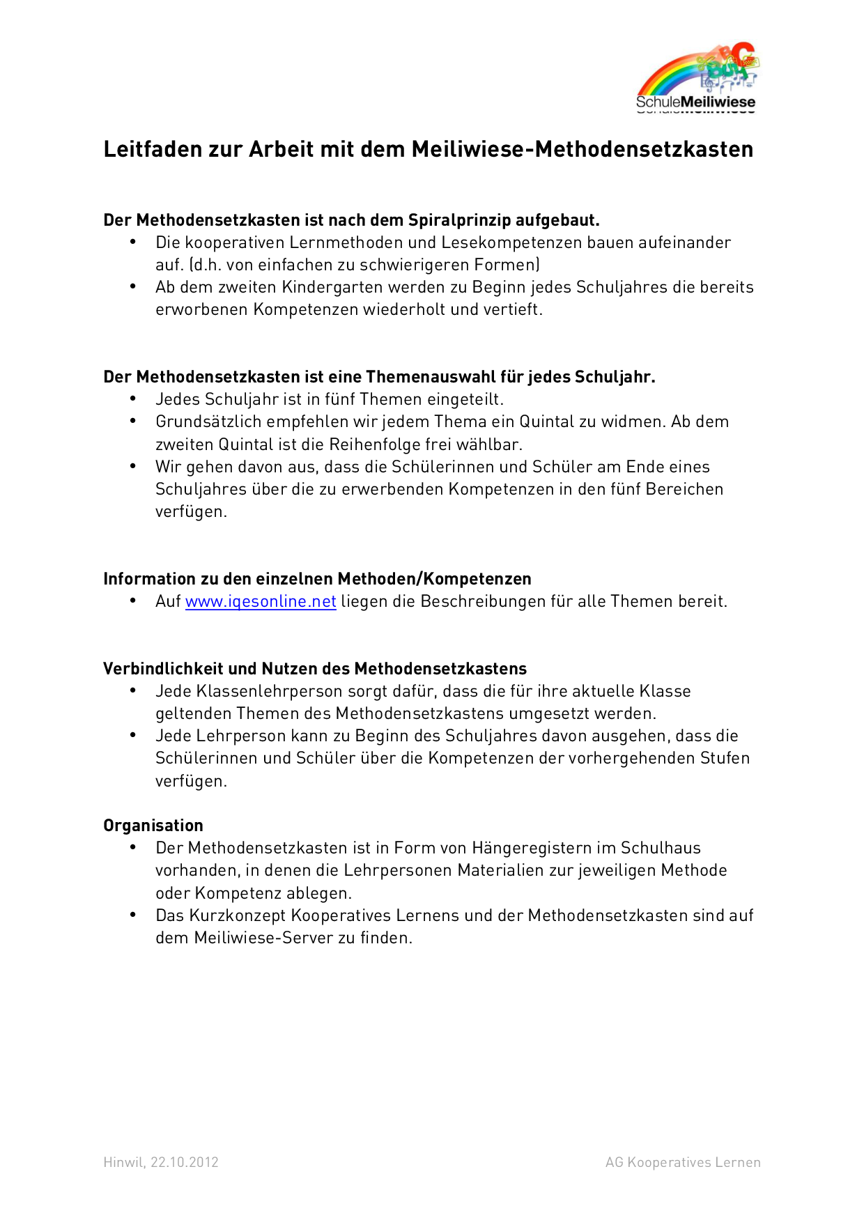 Mit einem Methodensetzkasten können die Methoden und Ziele der gesamten Schulzeit festgehalten werden. Am Beispiel der Schule Meiliwiese in diesem Dokument wird erkennbar, dass mit diesem Instrument unterschiedliche Schwerpunkte übersichtlich festgehalten werden können.