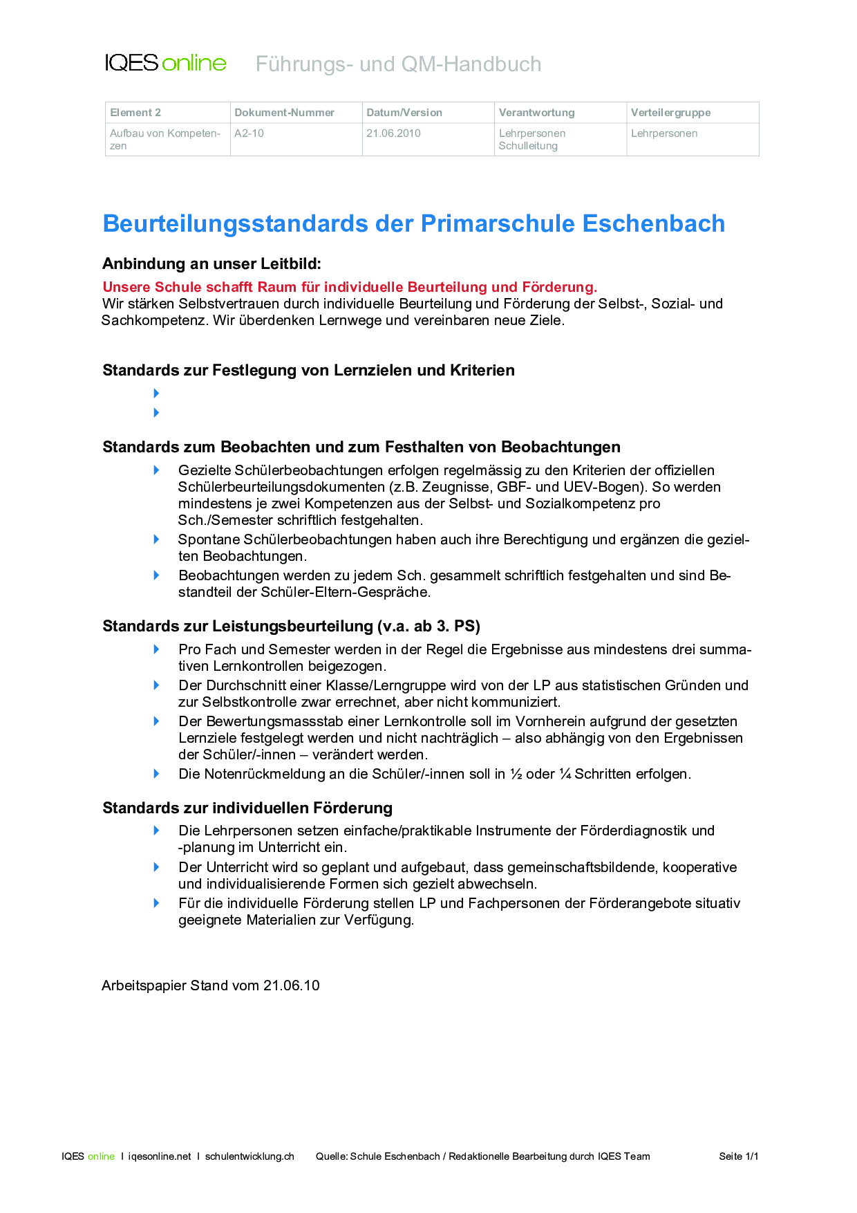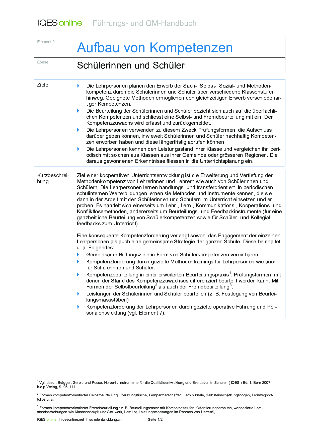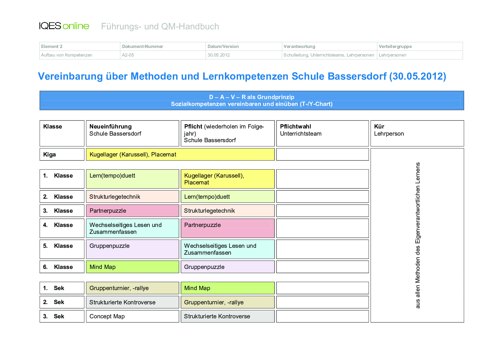 Element 2 für den Aufbau von Kompetenzen: Vereinbarung über Methoden und Lernkompetenzen der Schule Bassersdorf.