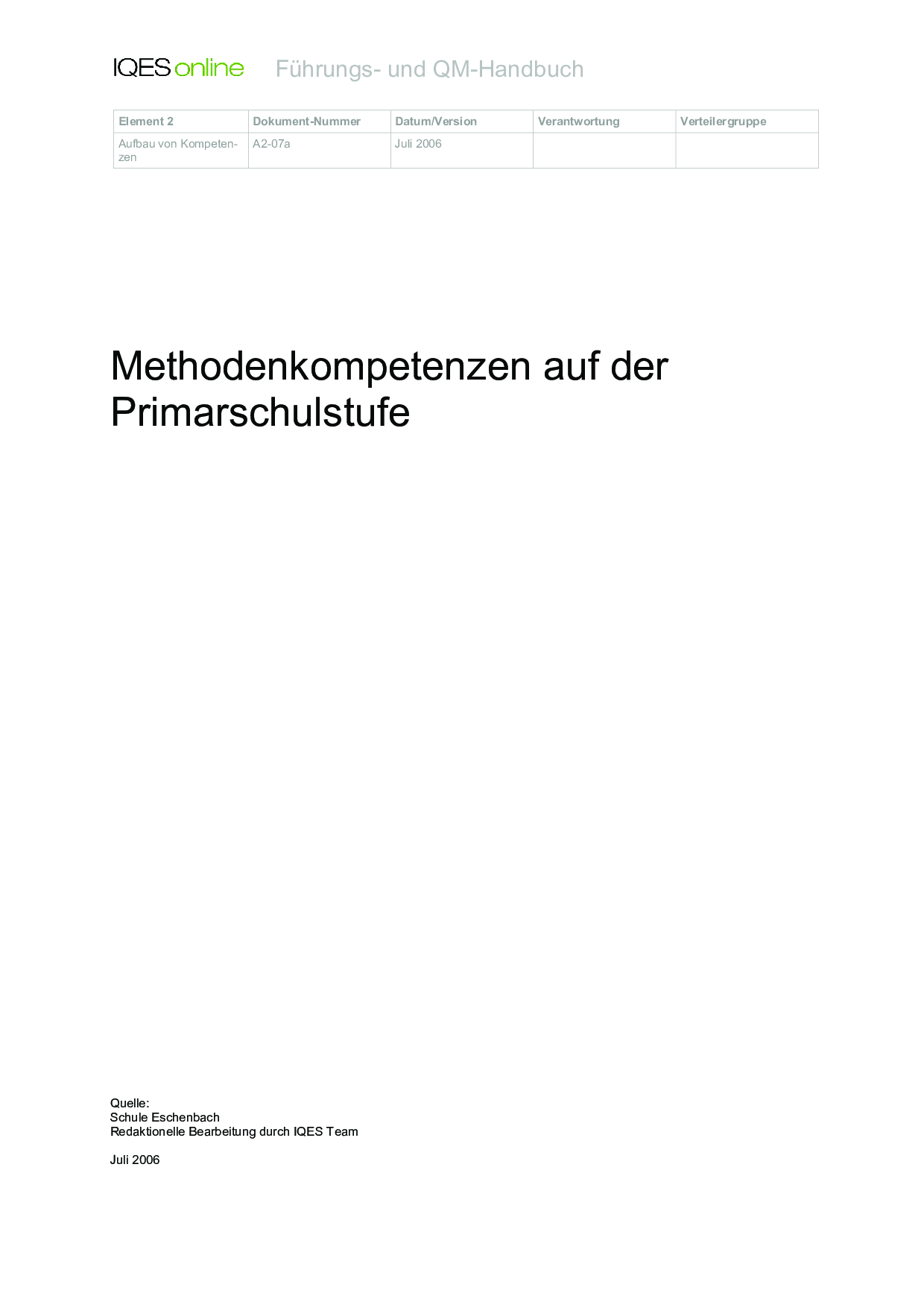 Wie das Erreichen von Methodenkompetenzen auf der Primarschulstufe erreicht werden kann, zeigt dieses Beispiel der Schule Eschenbach. Anhand einer Tabelle kann nachverfolgt werden, zu welchem Zeitpunkt welche Fertigkeit wie weit ausgereift sein sollte.