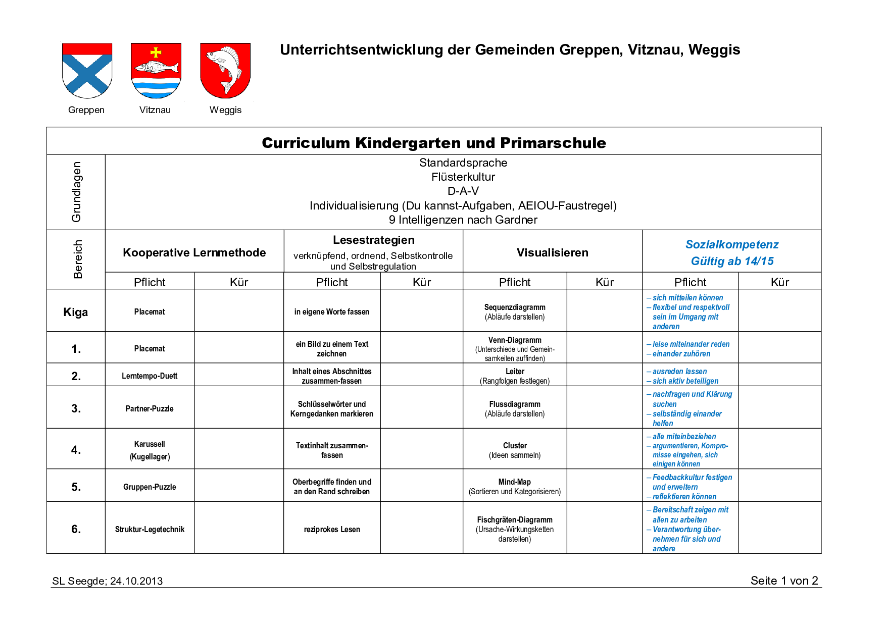 In diesem Dokument wird beispielhaft der Curriculum für Kindergarten und Primarschule der Gemeinden Greppen, Vitznau und Weggis vorgestellt. Zu jeder überfachlichen Kompetenz sind Pflicht- und Kür-Ziele genannt.