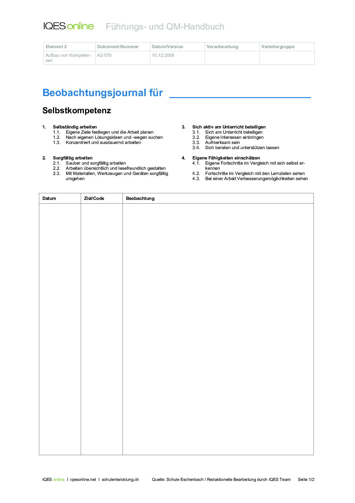 In diesem Beobachtungsjournal können Sozial- und Selbstkompetenzen selber eingetragen werden. Anhand von Stichworten und Zielsetzungen werden Inputs gegeben, sich mit den eigenen Kompetenzen auseinanderzusetzen.