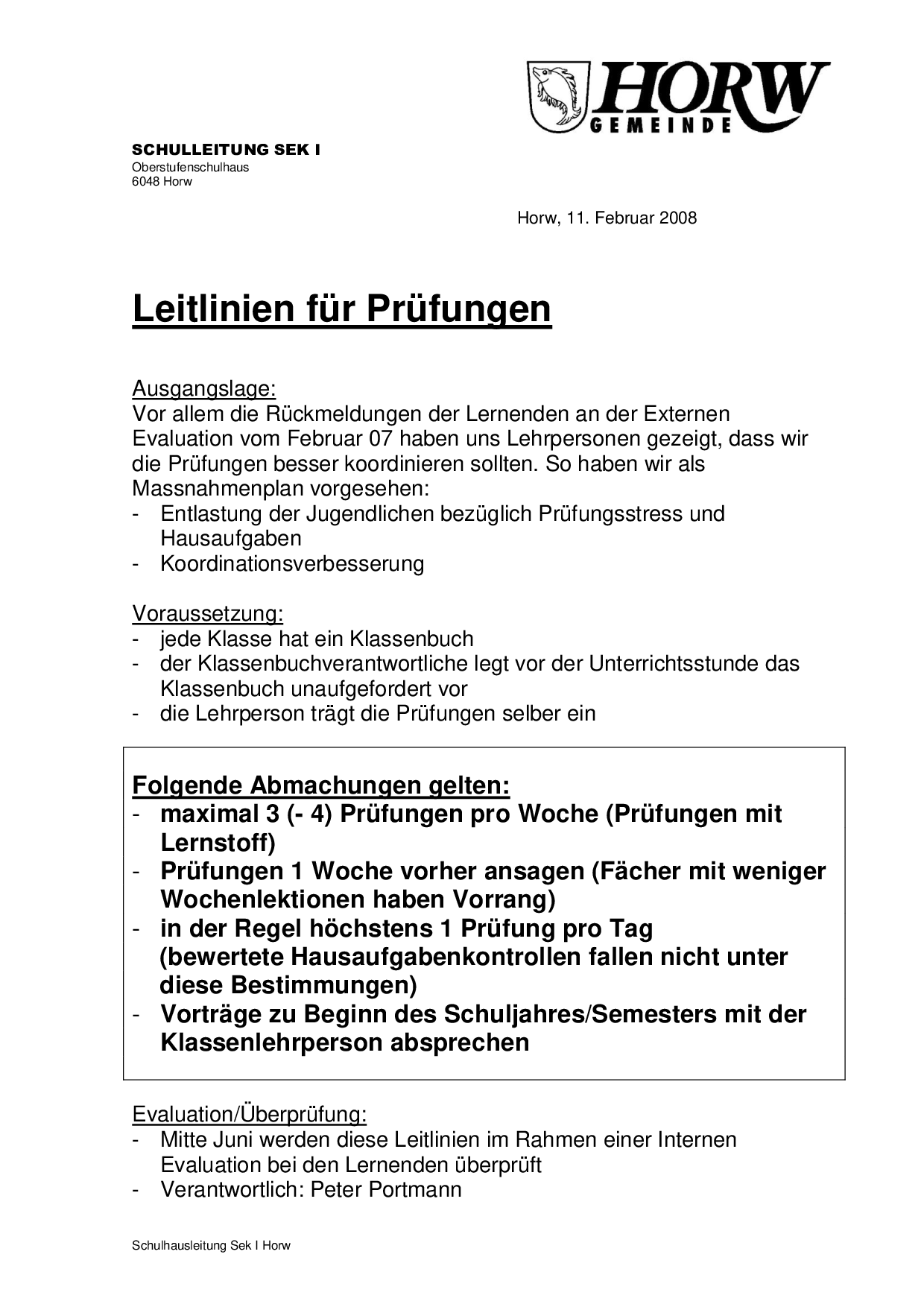 Hier werden die Leitlinien für Prüfungen an der Sekundarschule Horw aufgezählt. Darin sind die wichtigsten Punkte zu Augangslage, Voraussetzungen, Abmachungen und Evaluation festgelegt.