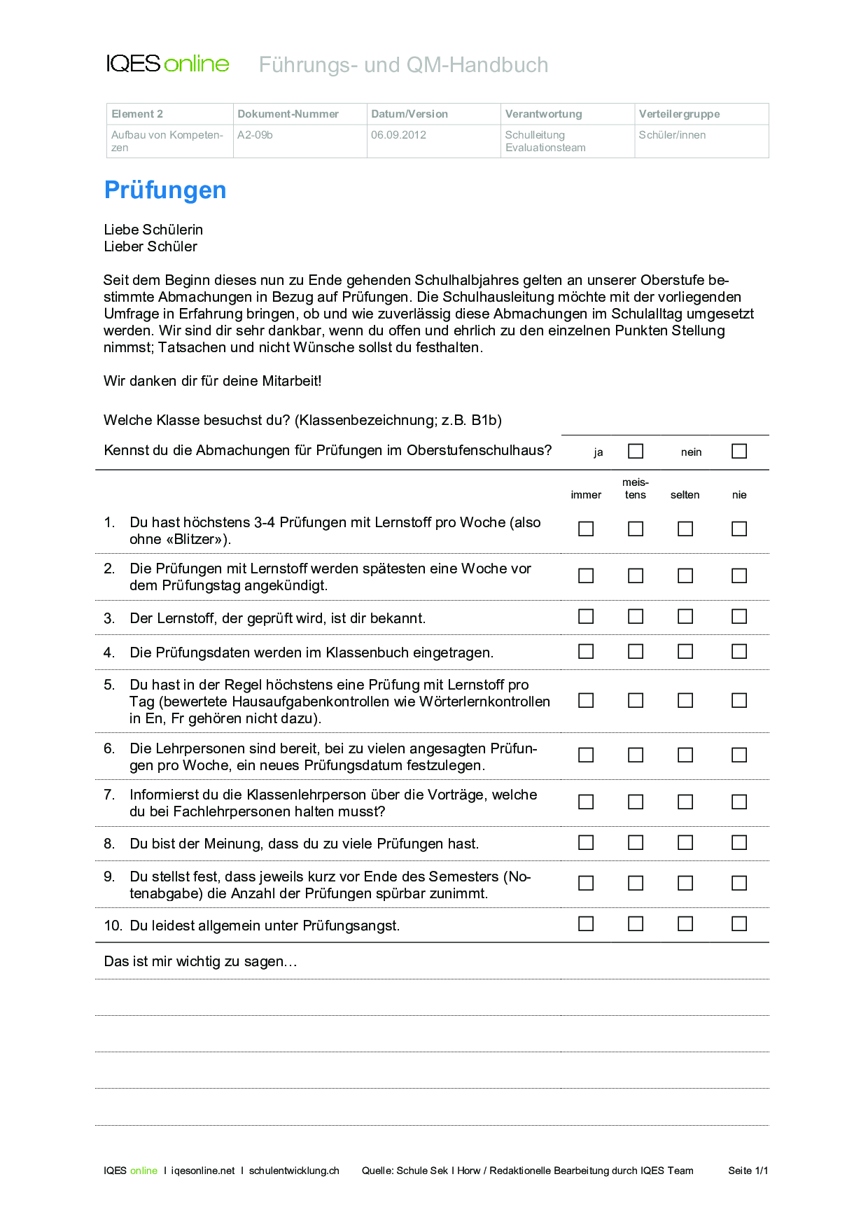Mit diesem Fragebogen können die Einschätzungen der Schülerinnen und Schüler bezüglich Prüfungen eingeholt werden. Erstellt wurde dieser von der Sek Horw. Für den individuellen Gebrauch kann der Inhalt abgeändert und angepasst werden.