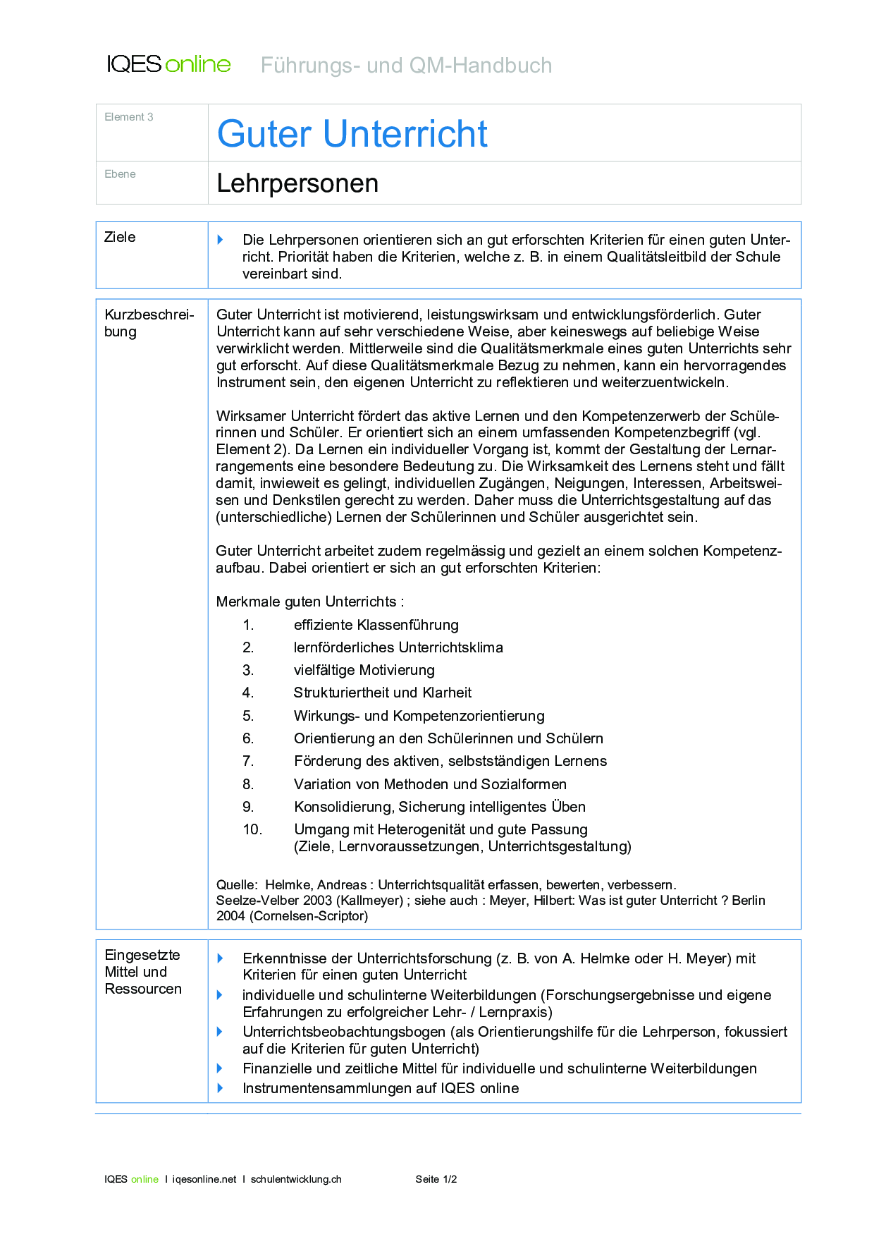 Herkunft: Gerold Brägger, Norbert Posse: Instrumente für die Qualitätsentwicklung und Evaluation in Schulen (IQES), Band 2. hep verlag, 2007. ISBN 9783039053483