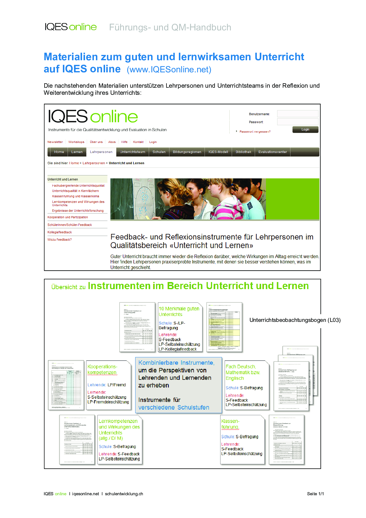 Die in diesem Dokument aufgeführten Materialien unterstützen Lehrpersonen und Unterrichtsteams in der Reflexion und Weiterentwicklung ihres Unterrichts. Damit kann man sich eine Übersicht über die Instrumenten im Bereich Unterricht und Lernen auf IQES online verschaffen.