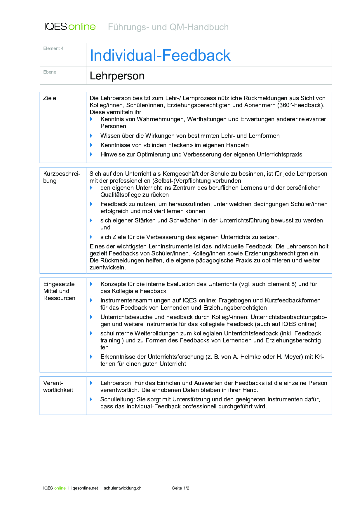 In diesem Dokument wird eine Übersicht über Materialien zum Individualfeedback auf IQES online geboten. Auf diesen finden Lehrpersonen Anleitungen und Feedbackinstrumente, um konstruktive Rückmeldungen von Lernenden, anderen Lehrpersonen und Eltern einzuholen.
