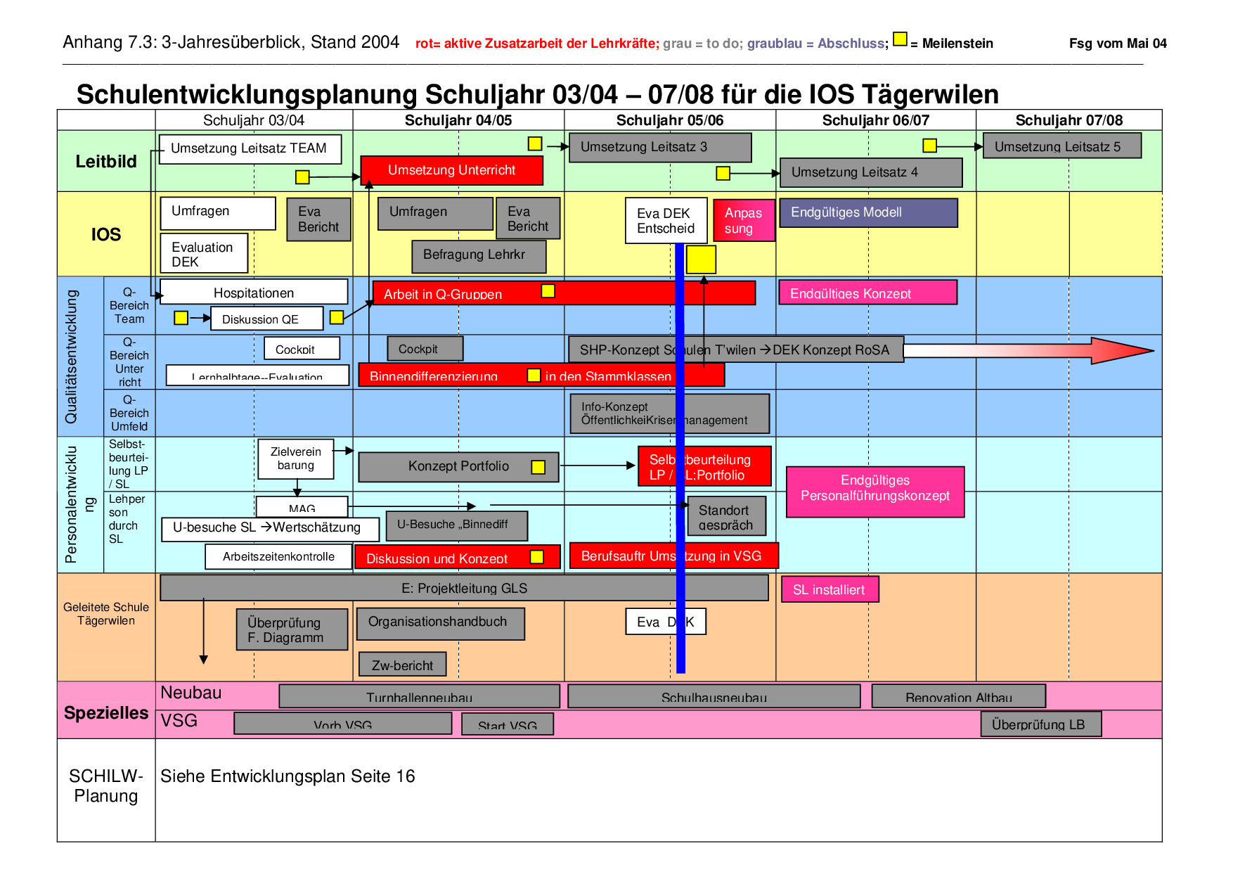 Hier ist ein Beispiel für einen 5-Jahresplan der Schule Weggis zu finden. Die Hauptkategorien sind interne Evaluationen, Jahresziele, Schul- und Unterrichtsentwicklung, Qualitätsgruppen, Weiterbildung sowie Eltern- und Lernen-denfeedback.