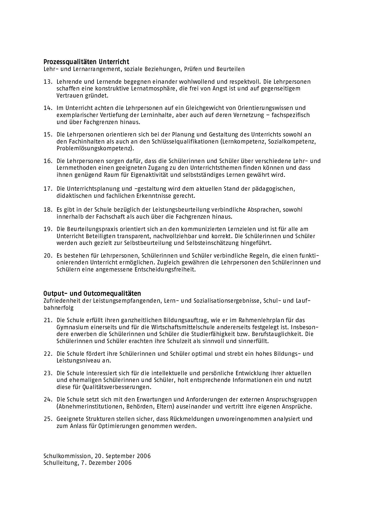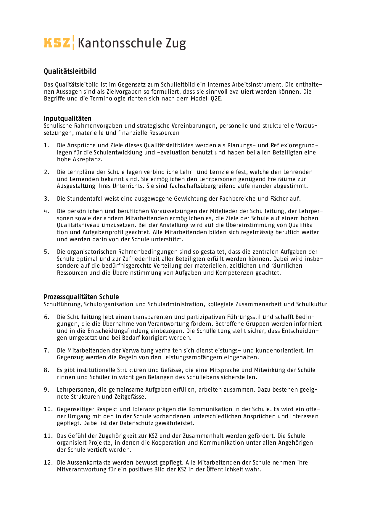 Anhand des Qualitätsleitbildes der Kantonsschule Zug kann ein Eindruck davon gewonnen werden, wie jenes der eigenen Schule aussehen könnte.