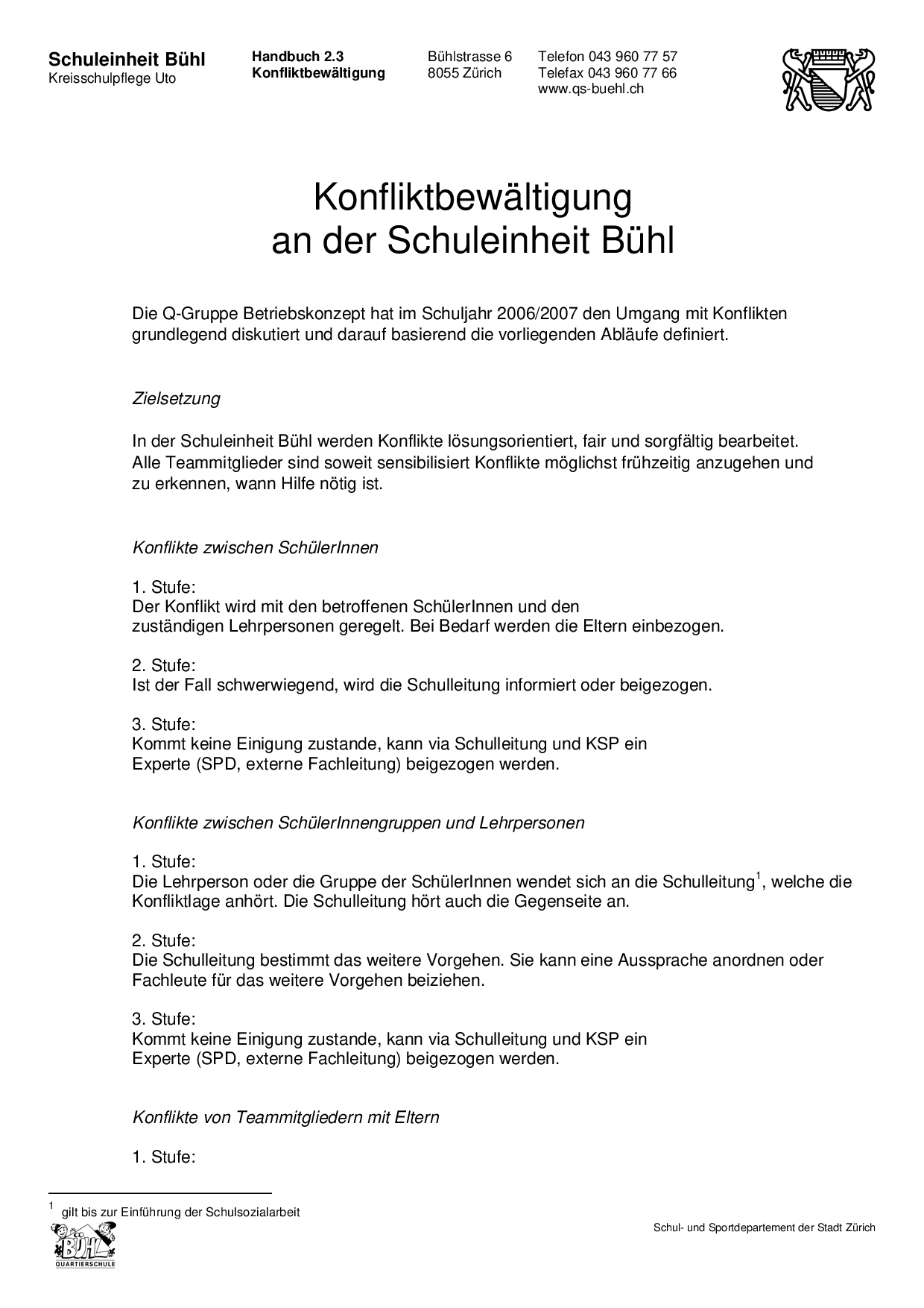 Die Q-Gruppe Betriebskonzept der Zürcher Schuleinheit Bühl hat im Schuljahr 2006/2007 den Umgang mit Konflikten grundlegend diskutiert und darauf basierend die vorliegenden Abläufe definiert.