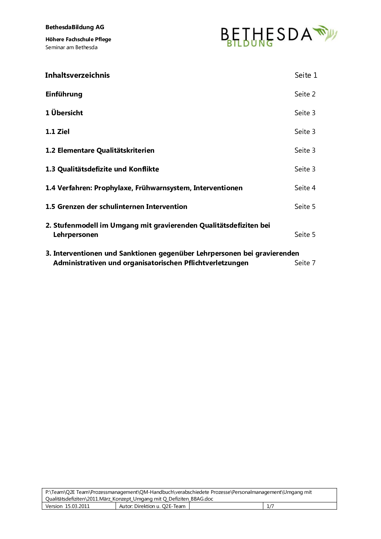 Dieses Konzept zum Umgang mit Qualitätsdefiziten wurde von der BBAG entworfen. Es beschreibt Grundsätze und Verfahren, wie festgestellte Defizite bei Lehrpersonen, Mitarbeitenden und Dozenten/-innen, konstruktiv aufgearbeitet und Konflikte innerhalb der Schule gelöst werden können.