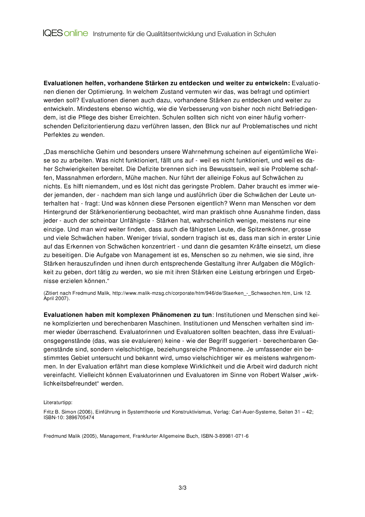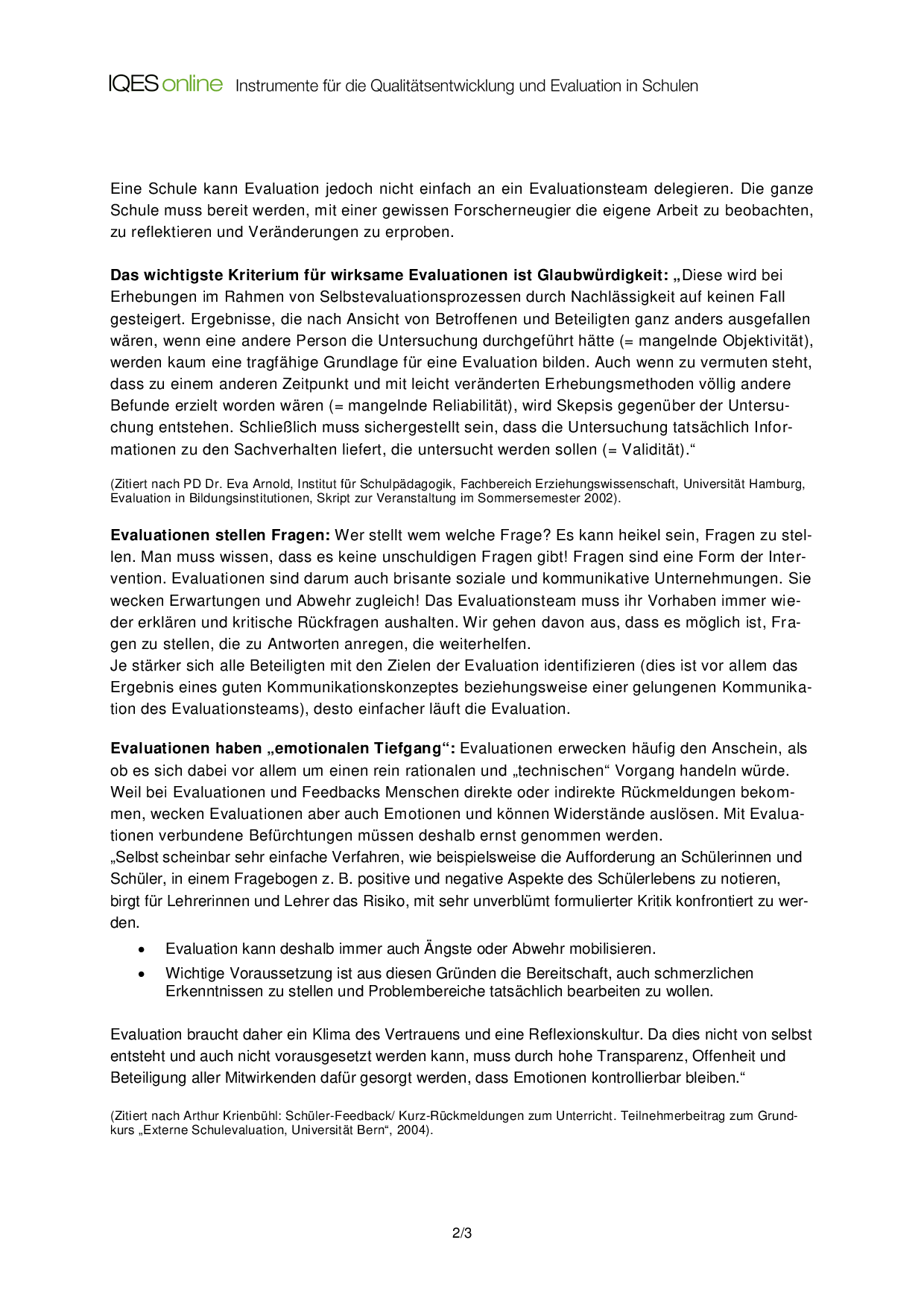 Evaluation hat sich als Methode einer nachhaltigen Schulentwicklung sehr bewährt. Sie ist ein Handwerk, das gelernt werden kann, am besten von einem schulinternen Evaluationsteam, das mit Ressourcen ausgestattet wird und einen längerfristigen Auftrag hat.