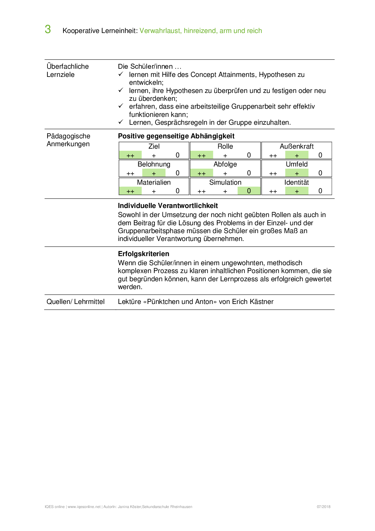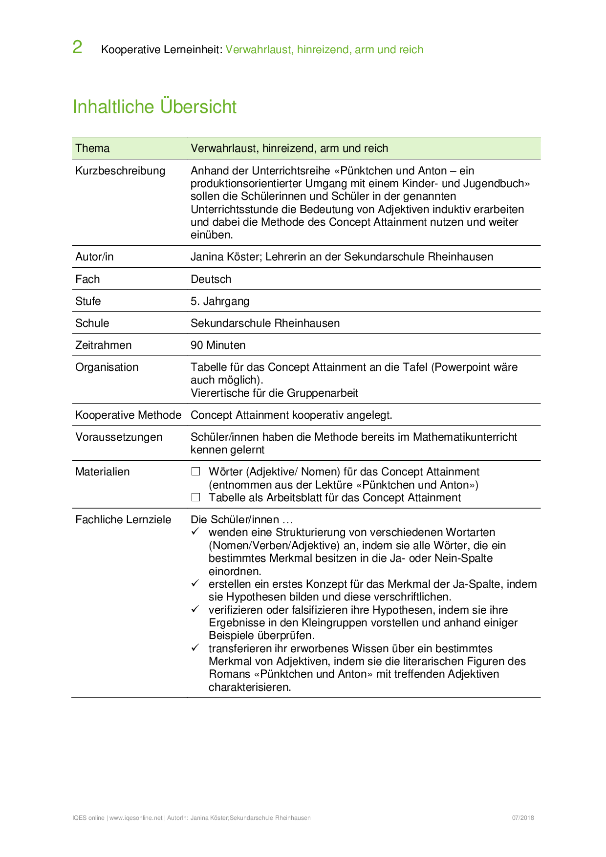Anhand der Unterrichtsreihe «Pünktchen und Anton - ein produktionsorientierter Umgang mit einem Kinder- und Jugendbuch» sollen die Lernenden in diesen Unterrichtsstunden die Bedeutung von Adjektiven induktiv erarbeiten und dabei die Methode des Concept Attainment nutzen.