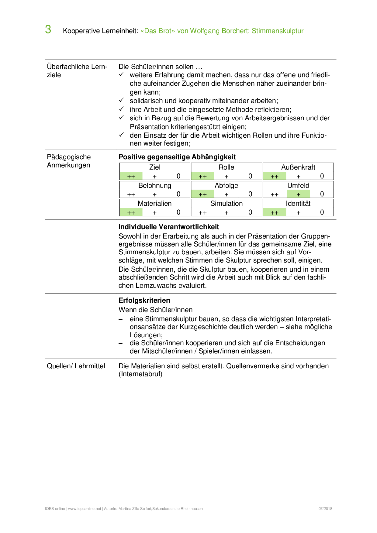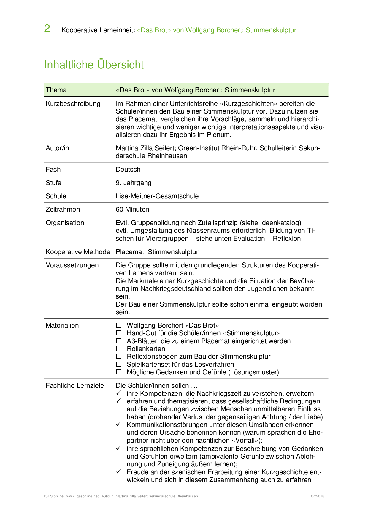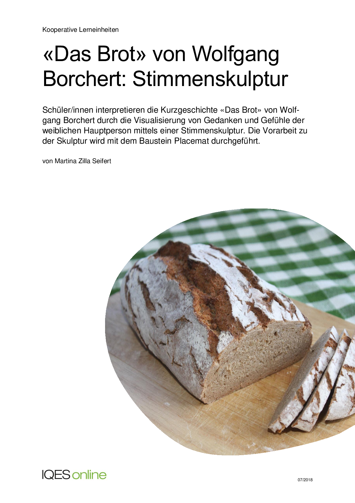Die Schülerinnen und Schüler interpretieren die Kurzgeschichte «Das Brot» von Wolfgang Borchert durch die Visualisierung von Gedanken und Gefühle der weiblichen Hauptperson mittels einer Stimmenskulptur. Die Vorarbeit zu der Skulptur wird mit dem Baustein «Placemat» durchgeführt.