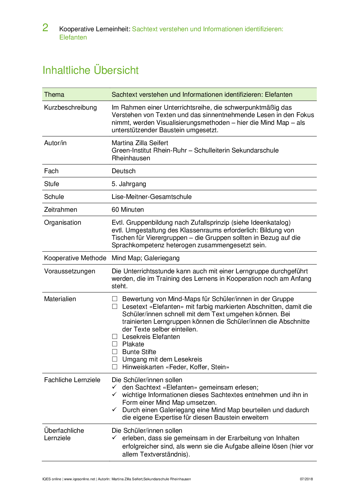 In dieser Unterrichtsstunde geht es darum, einen Sachtext über Elefanten zu verstehen und sinnvoll zusammenzufassen. Dazu wird das Mind-Map als Instrument benutzt. Diese werden bei einem Galeriegang von den Mitschülerinnen und Mitschülern bewertet.