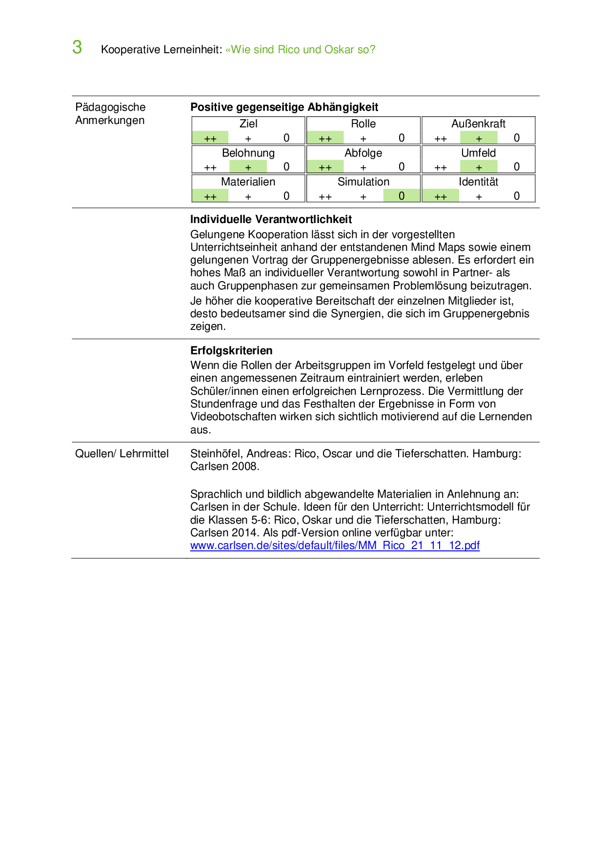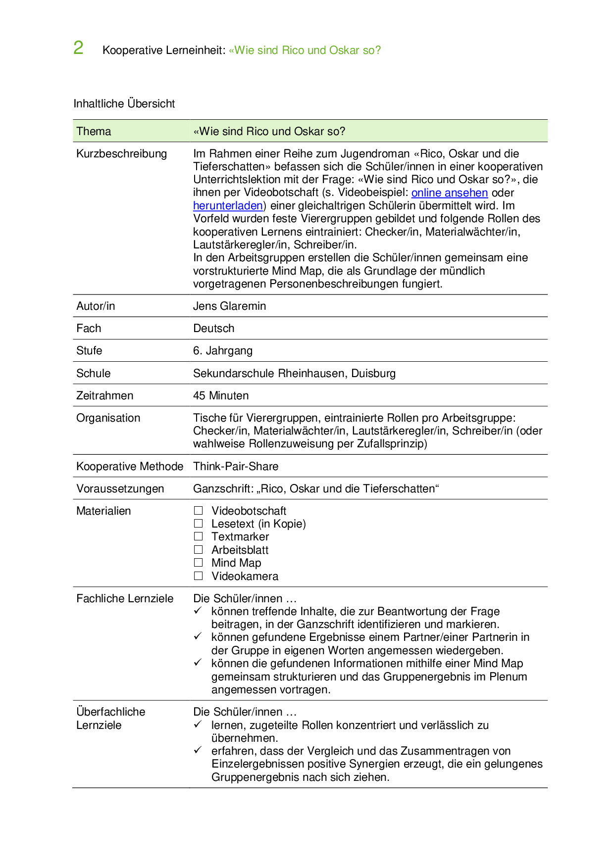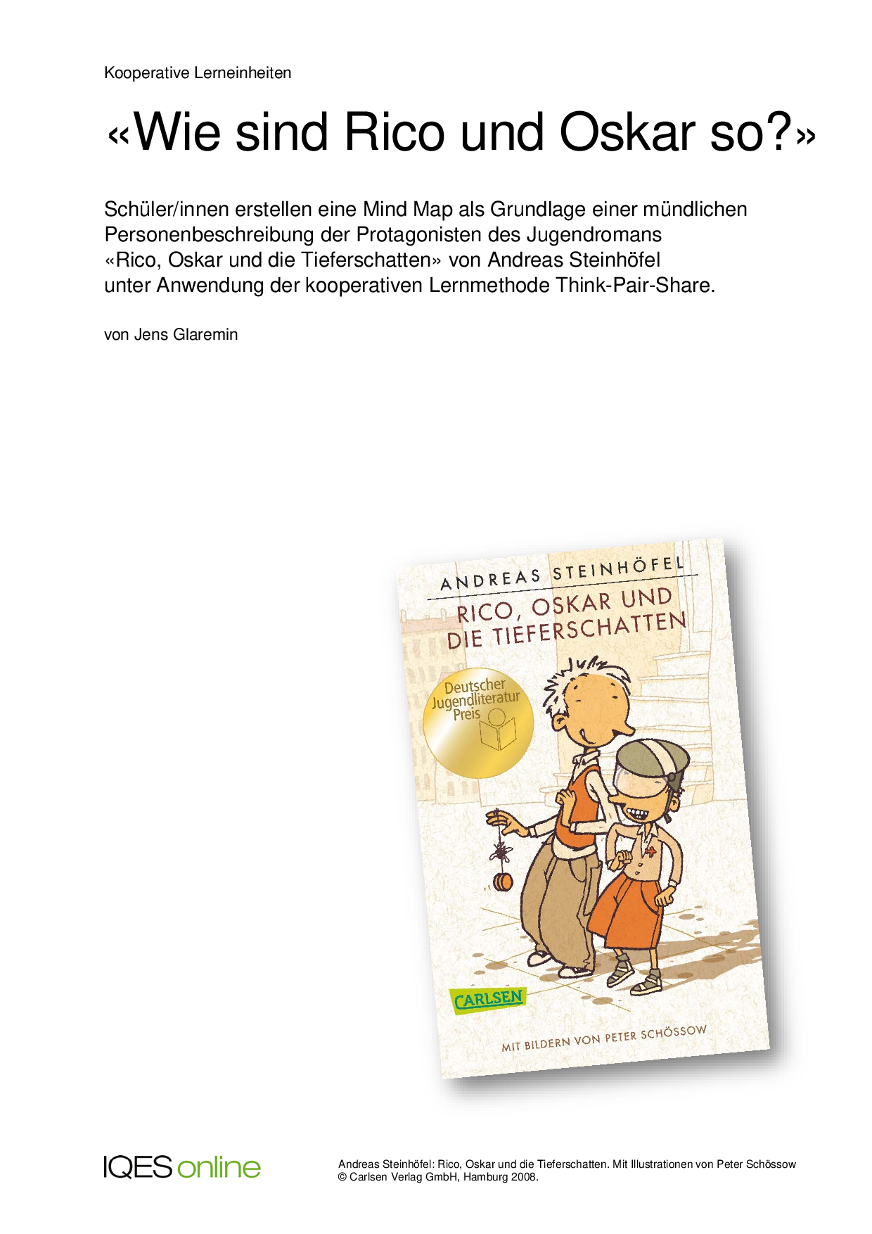 Diese Aufgabe richtet sich an Schüler und Schülerinnen der 6. Klasse des Faches Deutsch und benötigt 1 Lektion: Sie erstellen ein Mind Map als Grundlage einer mündlichen Personenbeschreibung der Protagonisten des Jugendromans «Rico, Oskar und die Tieferschatten» von Andreas Steinhöfel unter Anwendung der kooperativen Lernmethode Think-Pair-Share.