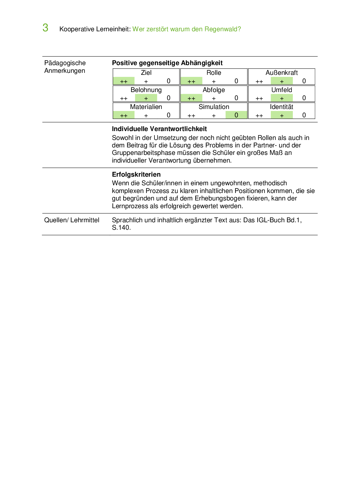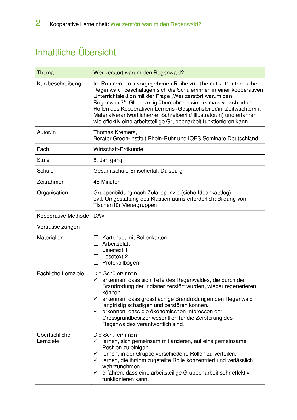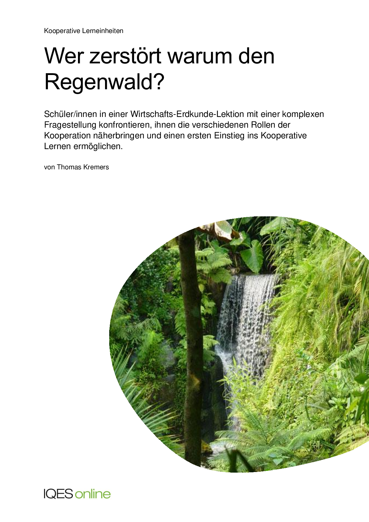 Im Rahmen einer vorgegebenen Reihe zur Thematik «Der tropische Regenwald» beschäftigen sich die Schülerinnen und Schüler in einer kooperativen Unterrichtslektion mit der Frage «Wer zerstört warum den Regenwald?». Gleichzeitig übernehmen sie erstmals verschiedene Rollen des Kooperativen Lernens (z.B. Gruppenleitung oder Zeitwächter) und erfahren, wie effektiv eine arbeitsteilige Gruppenarbeit funktionieren kann.