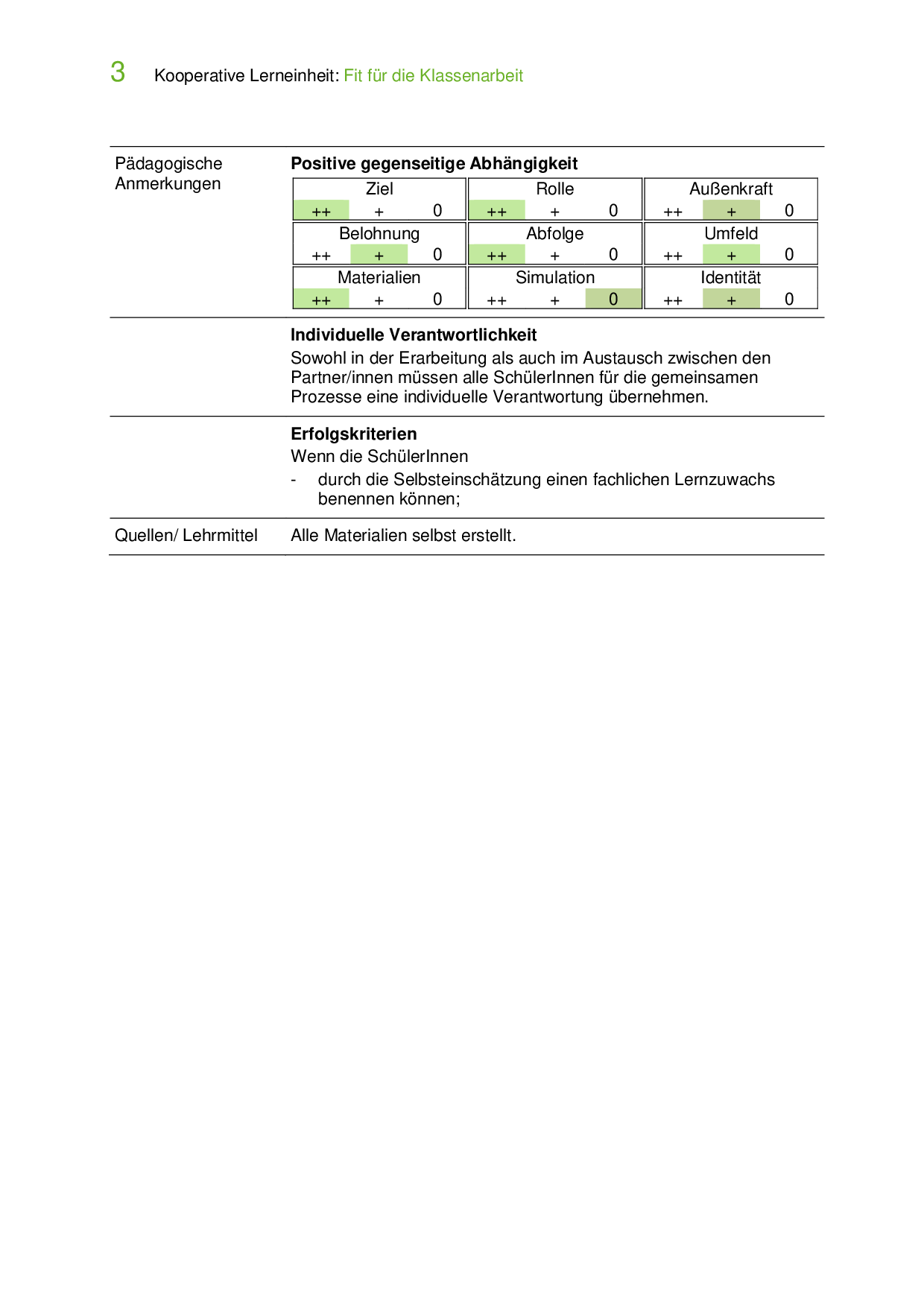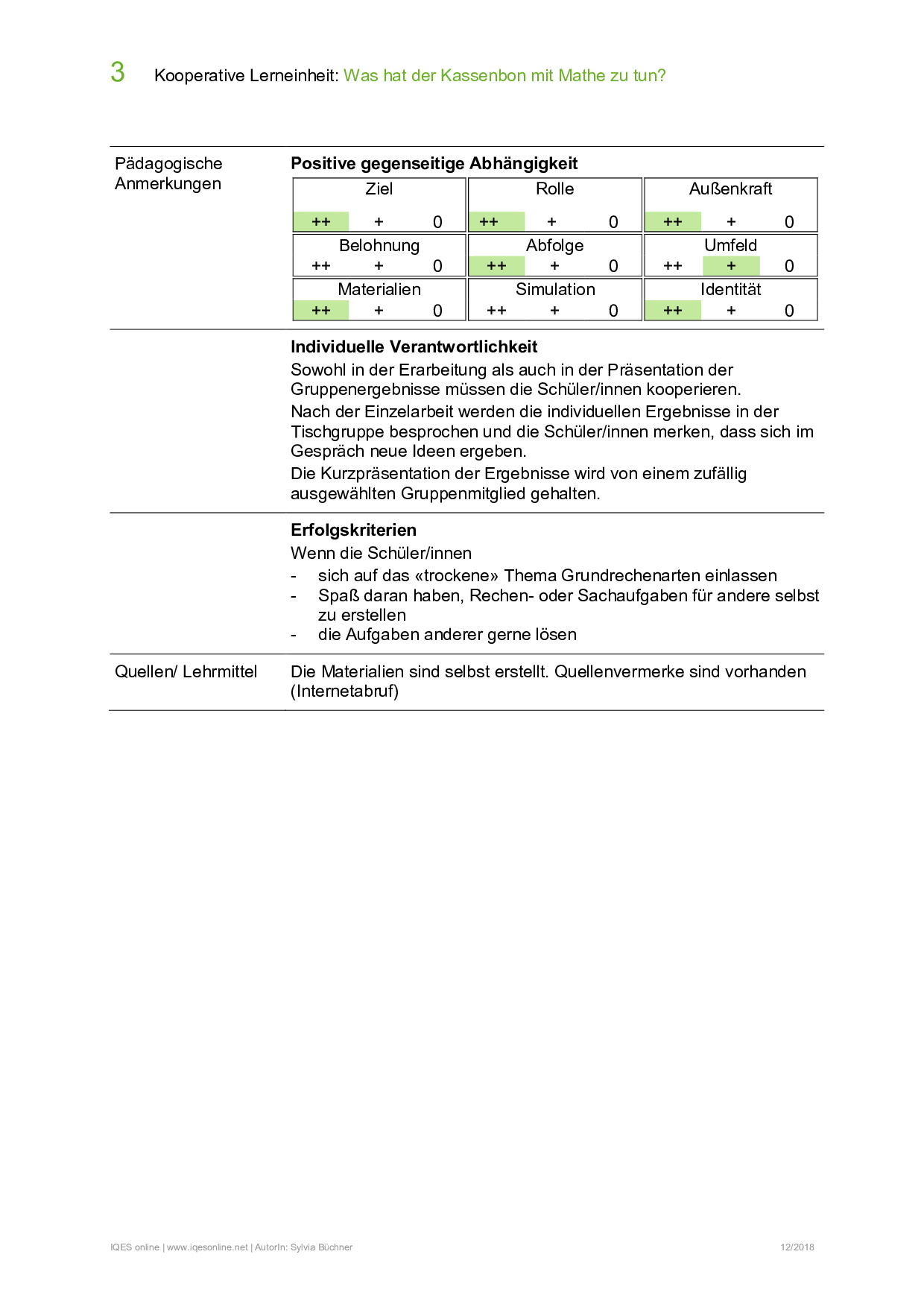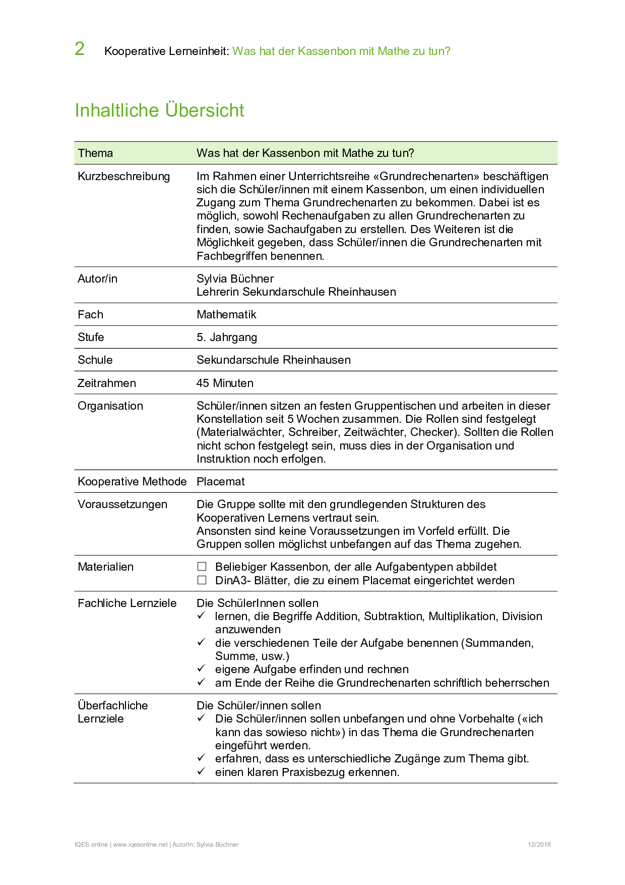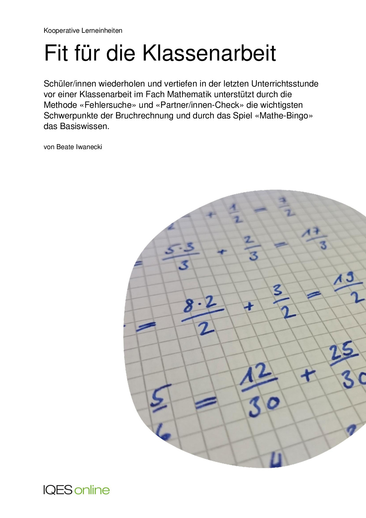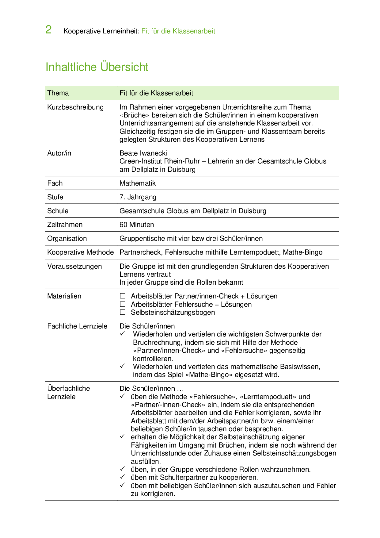 Im Rahmen einer vorgegebenen Unterrichtsreihe zum Thema «Brüche» bereiten sich die Schüler/innen in einem kooperativen Unterrichtsarrangement auf eine anstehende Klassenarbeit im Fach Mathematik vor. Gleichzeitig festigen sie die im Gruppen- und Klassenteam bereits gelegten Strukturen des Kooperativen Lernens.
