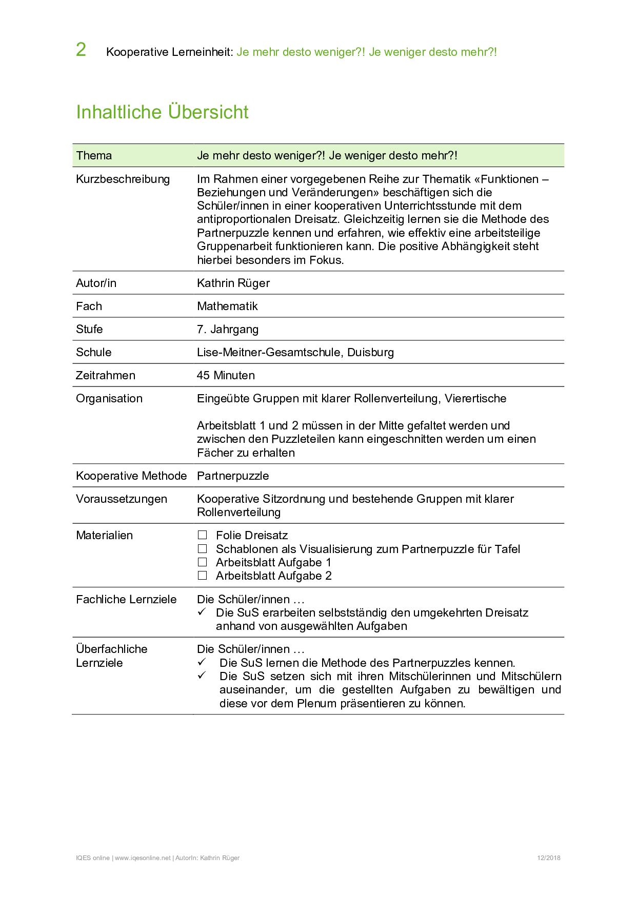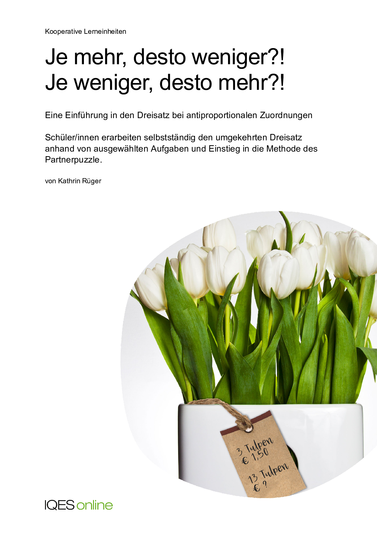 Eine Einführung in den Dreisatz bei antiproportionalen Zuordnungen. Die Schülerinnen und Schüler erarbeiten selbstständig den umgekehrten Dreisatz anhand von ausgewählten Aufgaben und Einstieg in die Methode des Partnerpuzzle. Diese Lerneinheit richtet sich an die 7. Klassenstufe im Fach Mathematik und benötigt 1 Lektion Zeit.