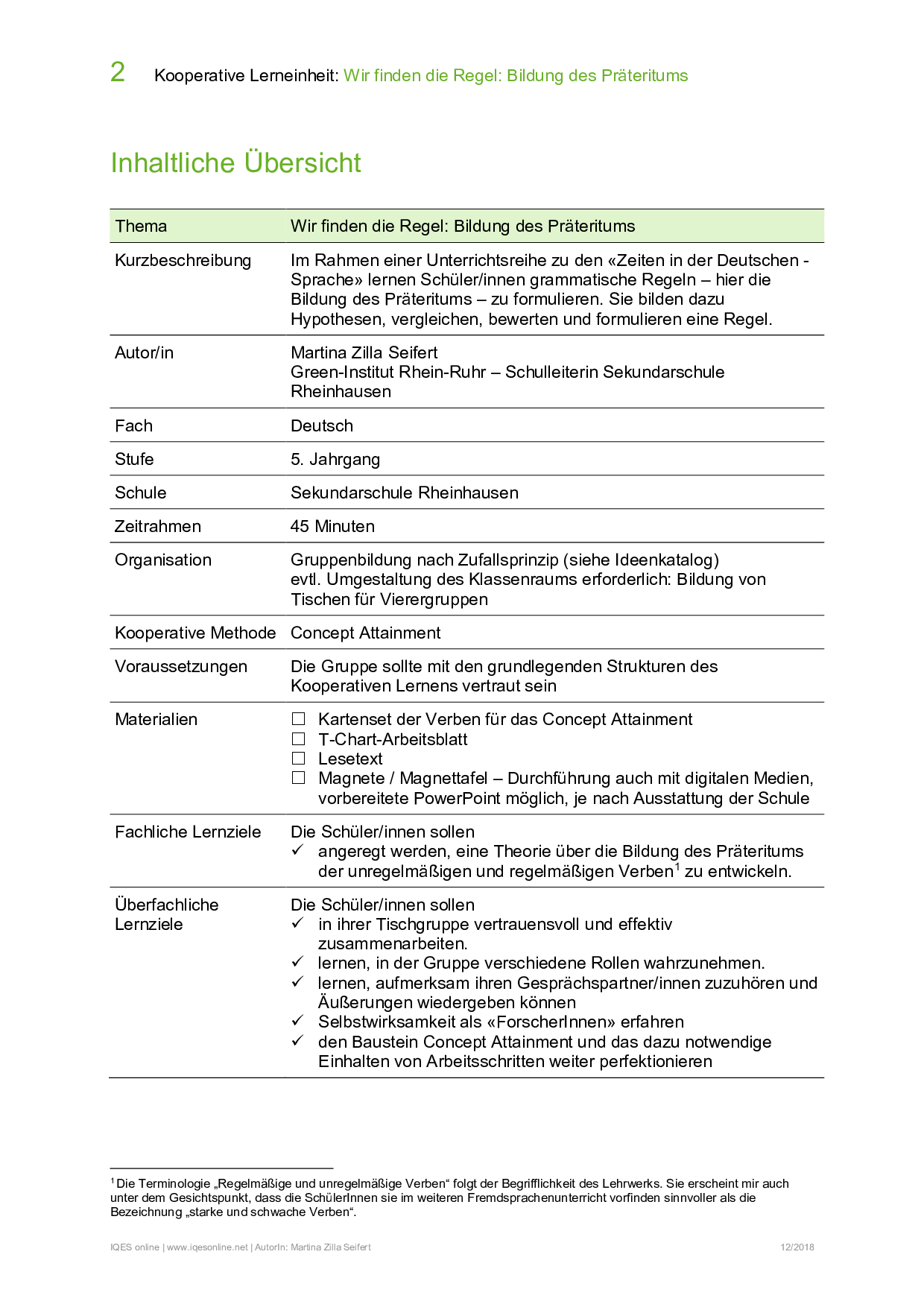Wir finden die Regel: Schülerinnen und Schüler entwickeln in einer Deutschstunde, geleitet durch die Methode Concept Attainment, die Regel zur Bildung des Präteritums der regelmässigen und unregelmässigen Verben. Diese Unterrichtseinheit benötigt 1 Lektion und richtet sich an die 5. Klassenstufe.