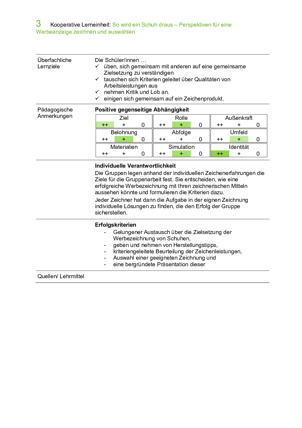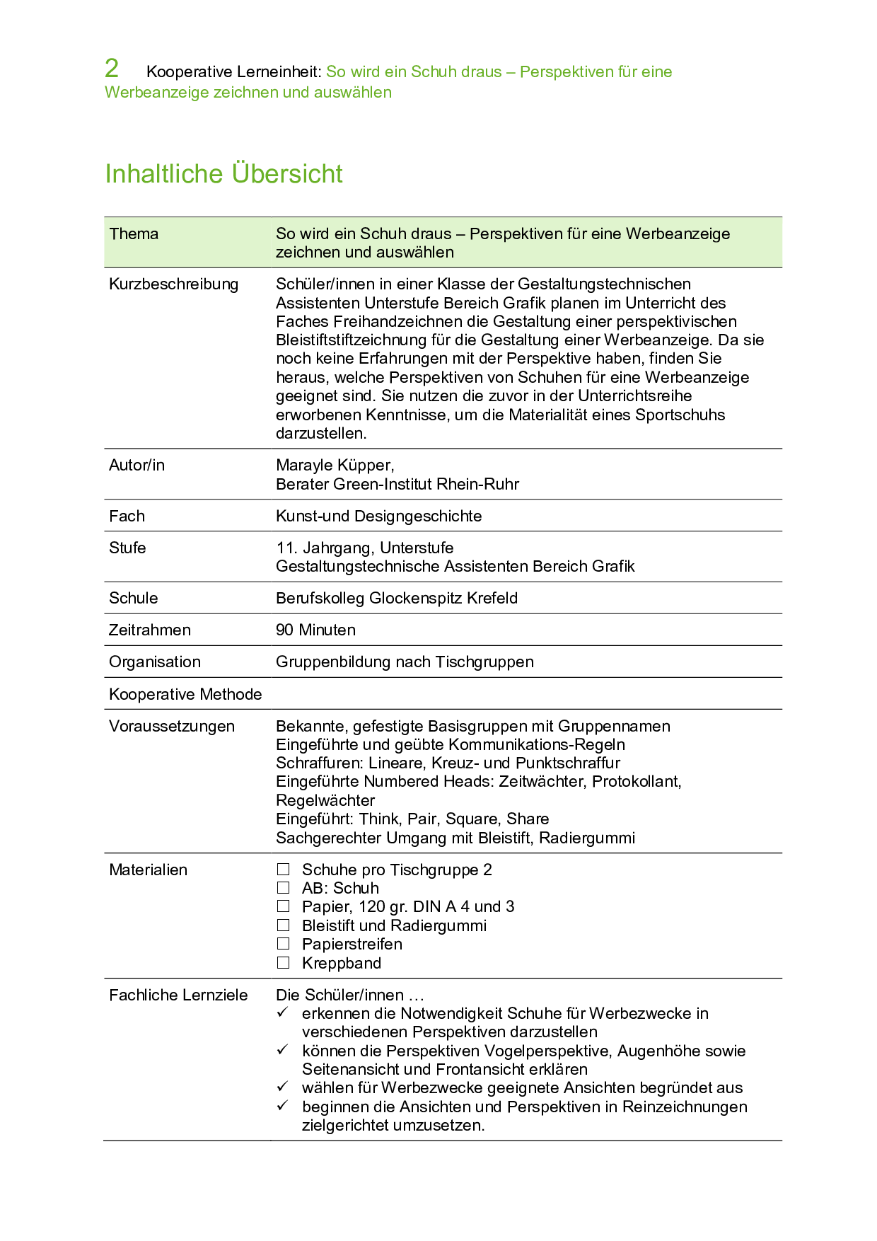In dieser kooperativen Lerneinheit planen die Lernenden im Unterricht des Faches Freihandzeichnen die Gestaltung einer perspektivischen Bleistiftstiftzeichnung. Diese soll als Werbeanzeige dienen. Neben der inhaltlichen Übersicht und dem Unterrichtsablauf ist auch ein Arbeitsblatt vorhanden.