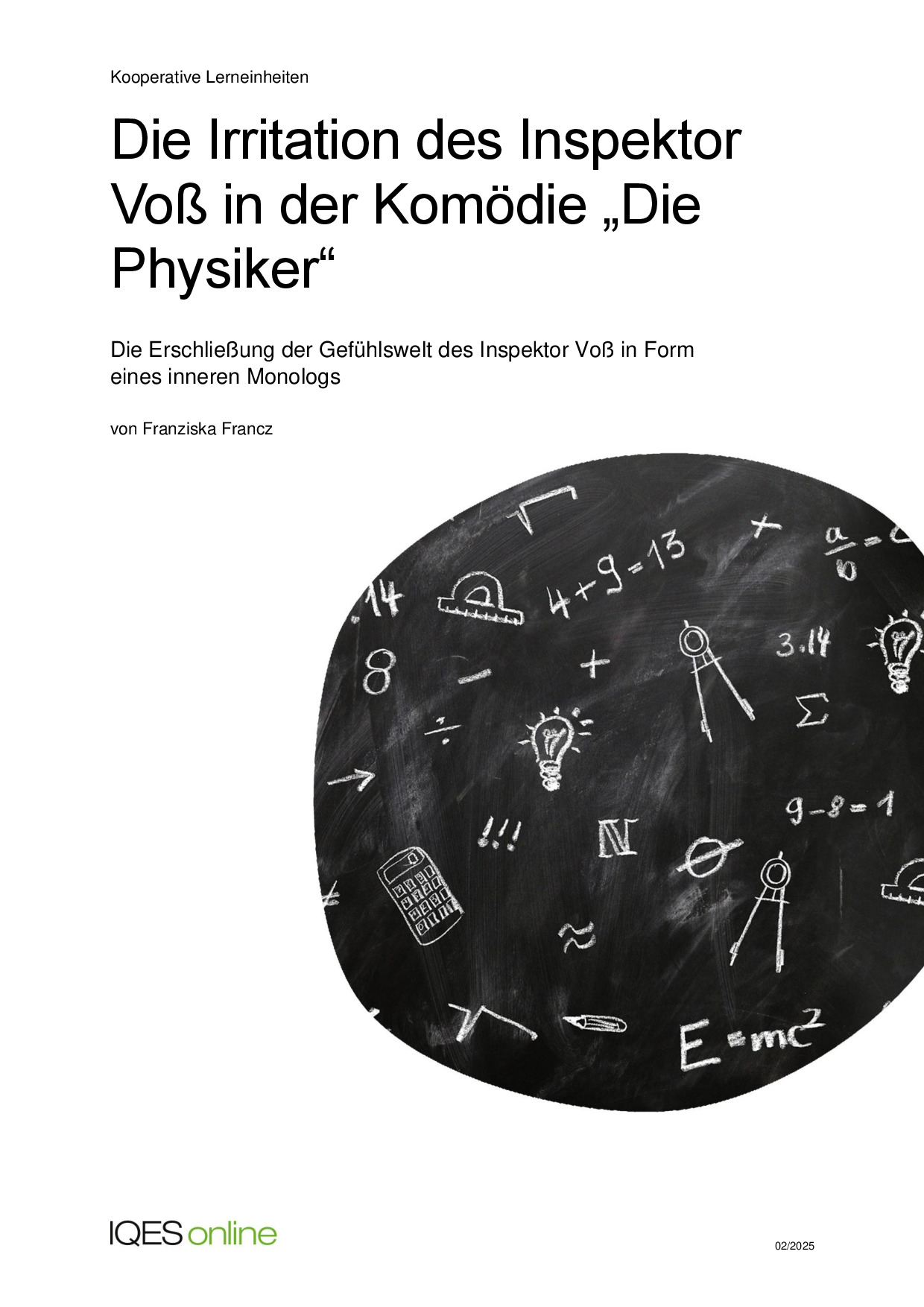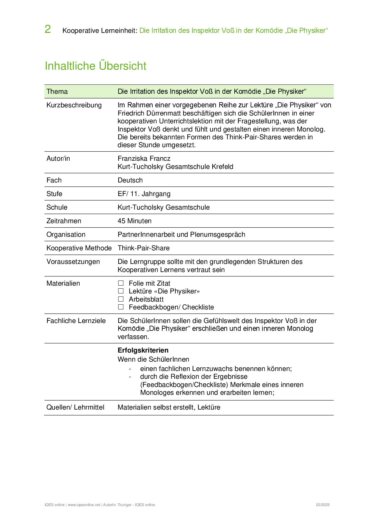 Im Rahmen einer vorgegebenen Reihe zur Lektüre „Die Physiker“ von Friedrich Dürrenmatt beschäftigen sich die SchülerInnen in einer kooperativen Unterrichtslektion mit der Fragestellung, was der Inspektor Voß denkt und fühlt und gestalten einen inneren Monolog. Die bereits bekannten Formen des Think-Pair-Shares werden in dieser Stunde umgesetzt.