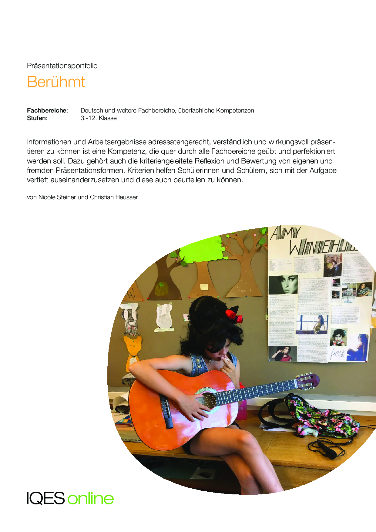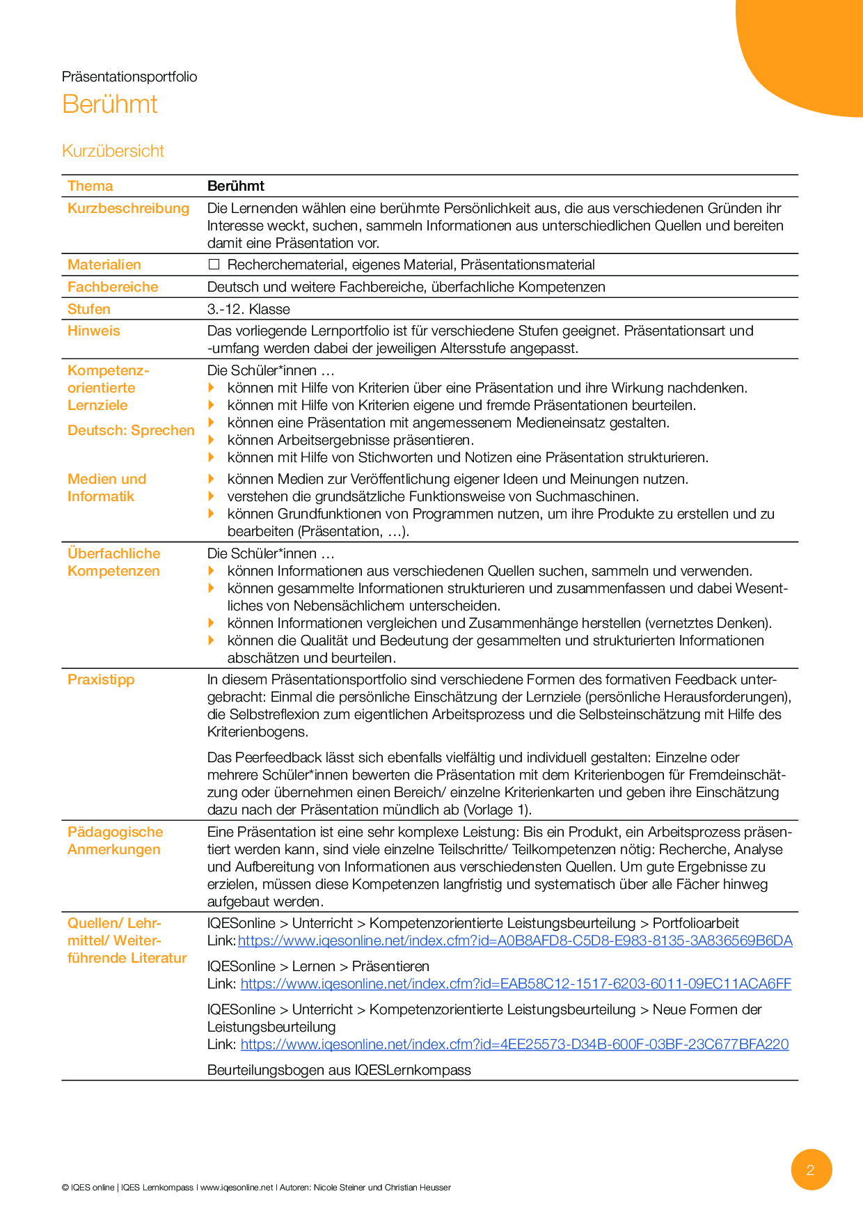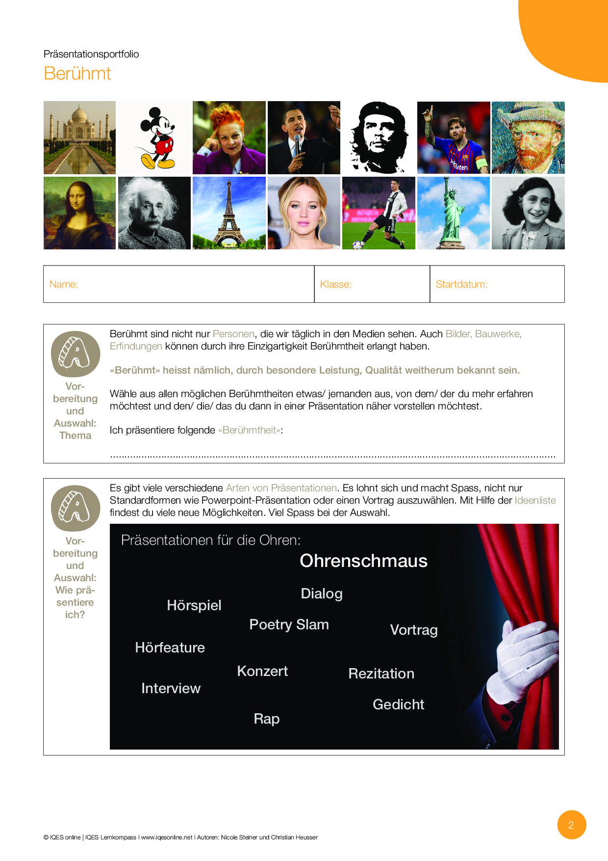 Das Präsentationsportfolio «Berühmt» hilft den Lernenden bei der Gestaltung einer Präsentation. Es werden Kriterien für eine gute Präsentation aufgelistet und ein Notizbaltt für Recherchen, ein Ideenblatt sowie eine Materialliste für die Präsentation zur Verfügung gestellt.