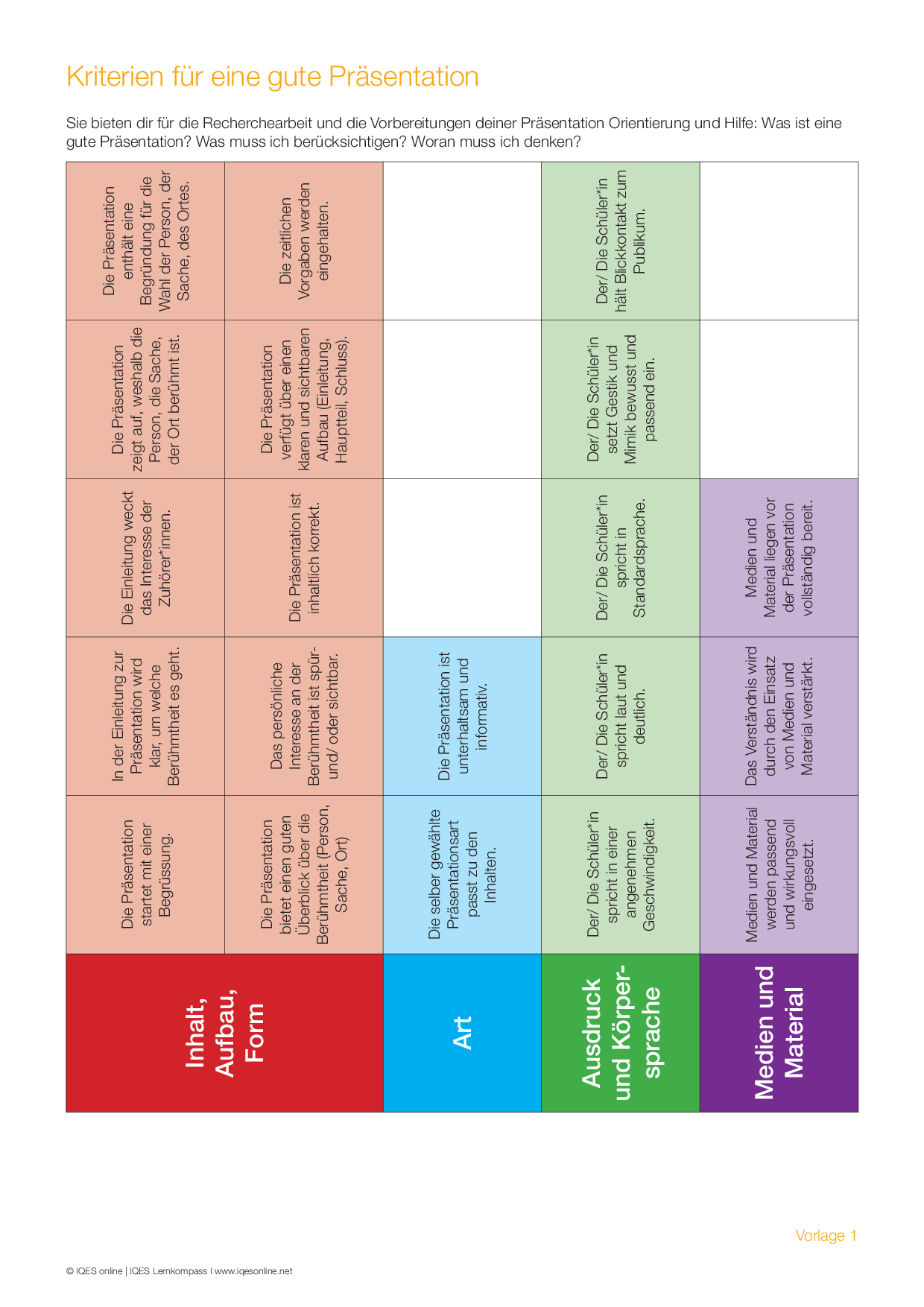 In diesem Präsentationsportfolio für die Lernenden werden unterschiedliche Arbeitsblätter zur Verfügung gestellt. Unter anderem auch ein Formular für ein kriteriengeleitete Reflexion und Bewertung von eigenen und fremden Präsentationsformen.